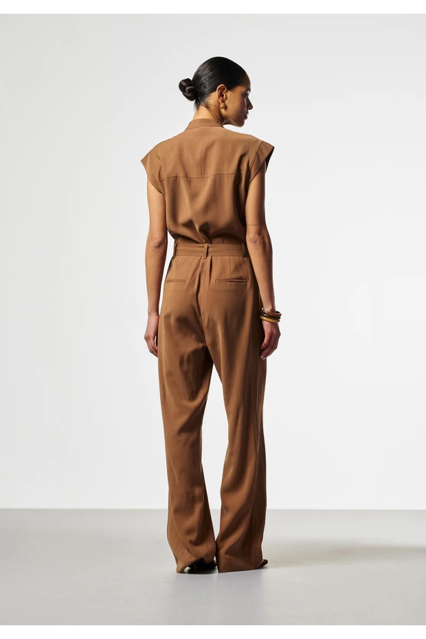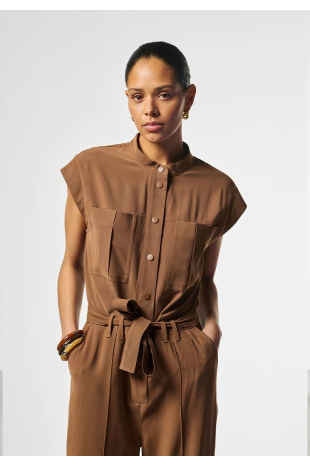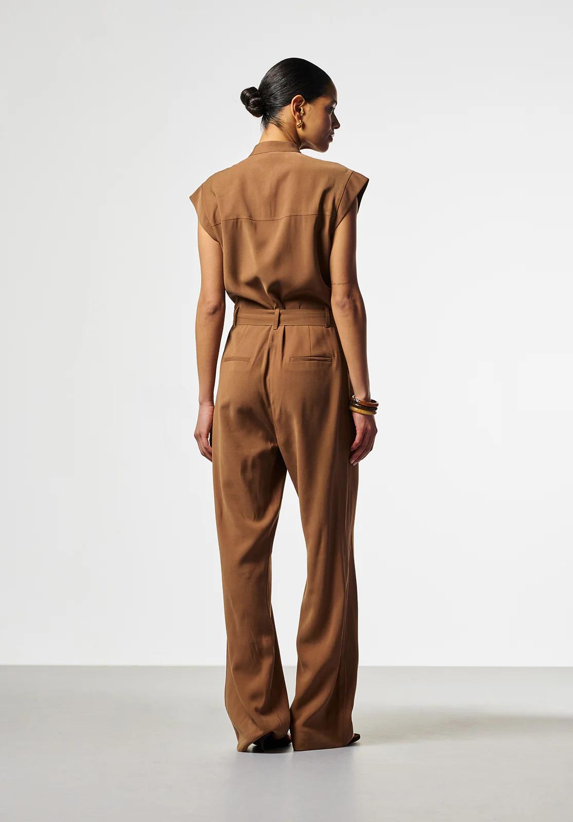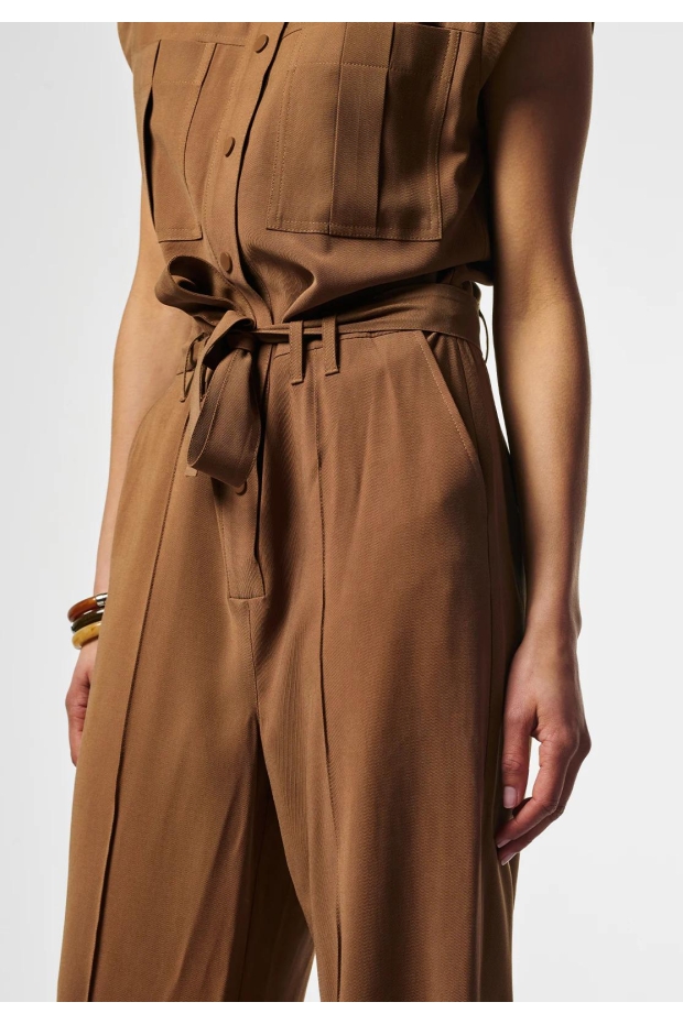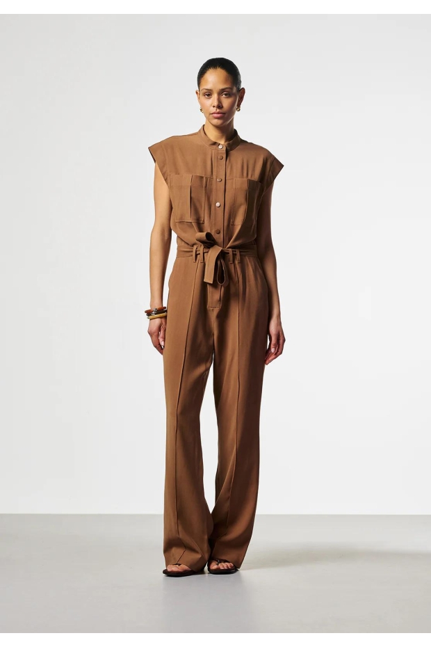 Maak kennis met de Aaiko Lisana Tencel jumpsuit in een prachtige hazelnootbruine tint. Deze stijlvolle jumpsuit is perfect voor de Nederlandse zomerdagen en biedt een combinatie van comfort en elegantie.