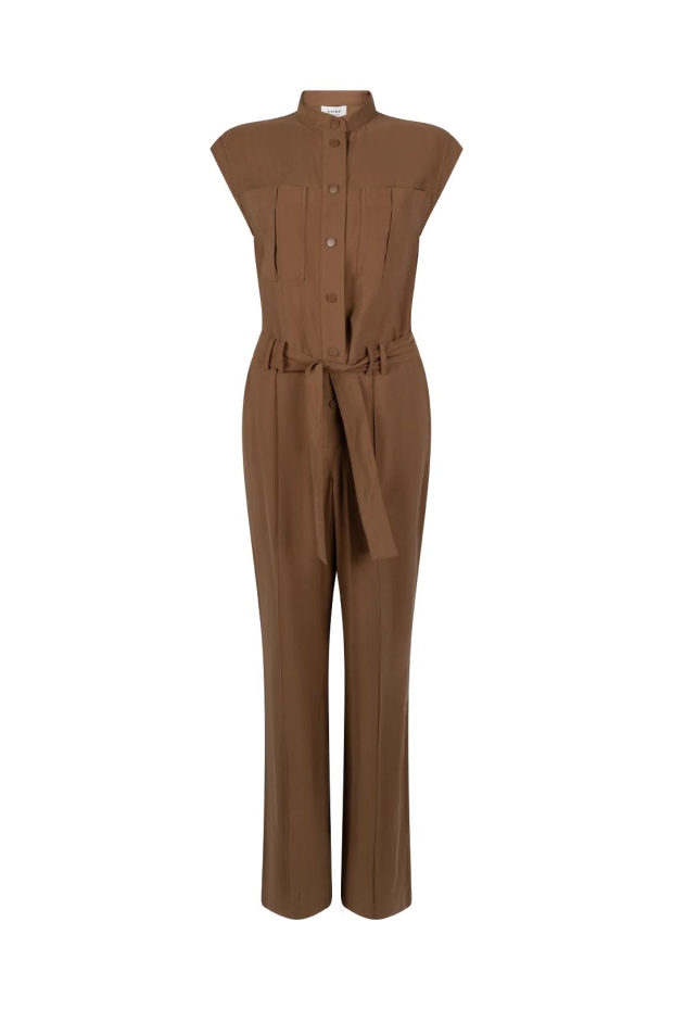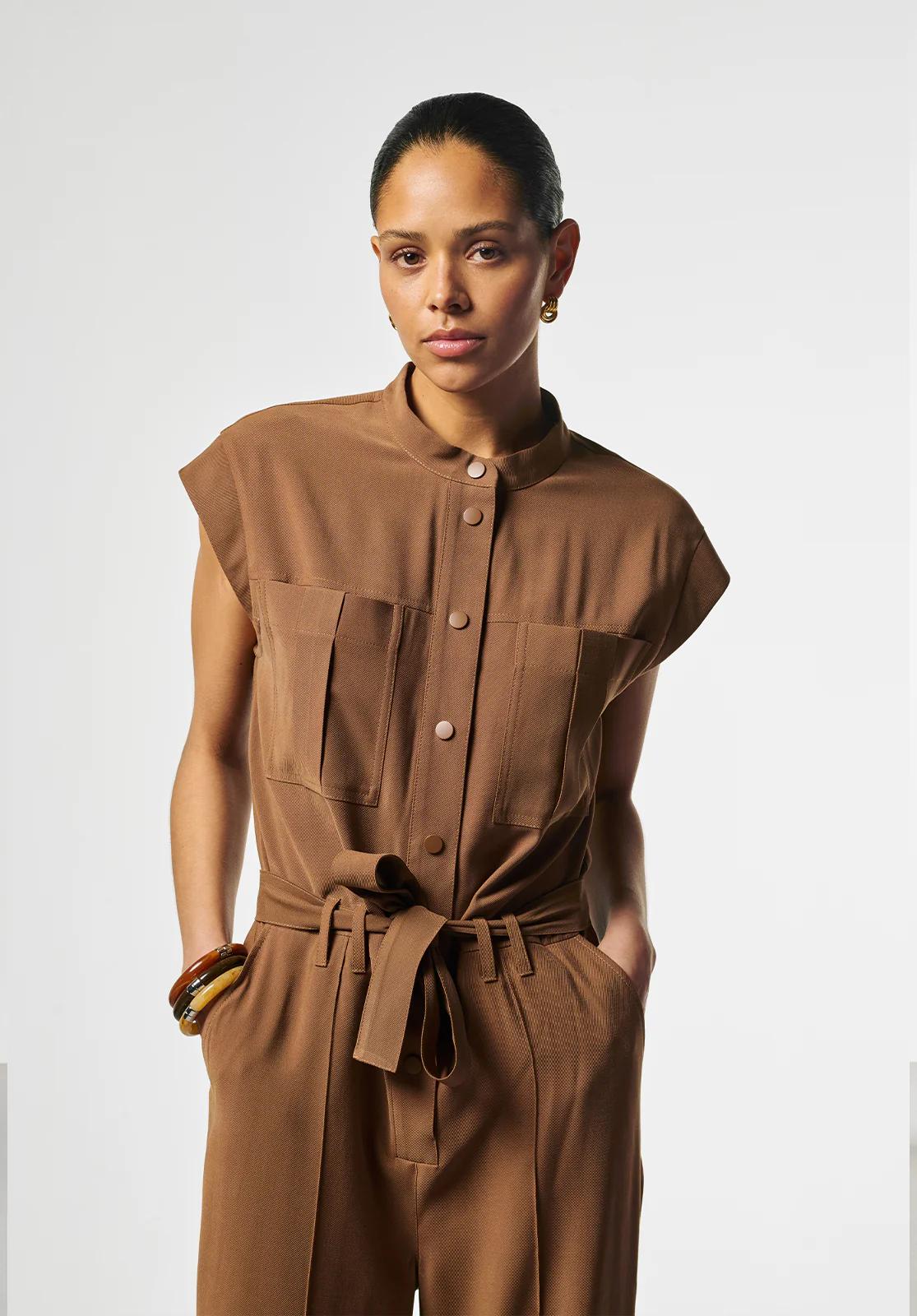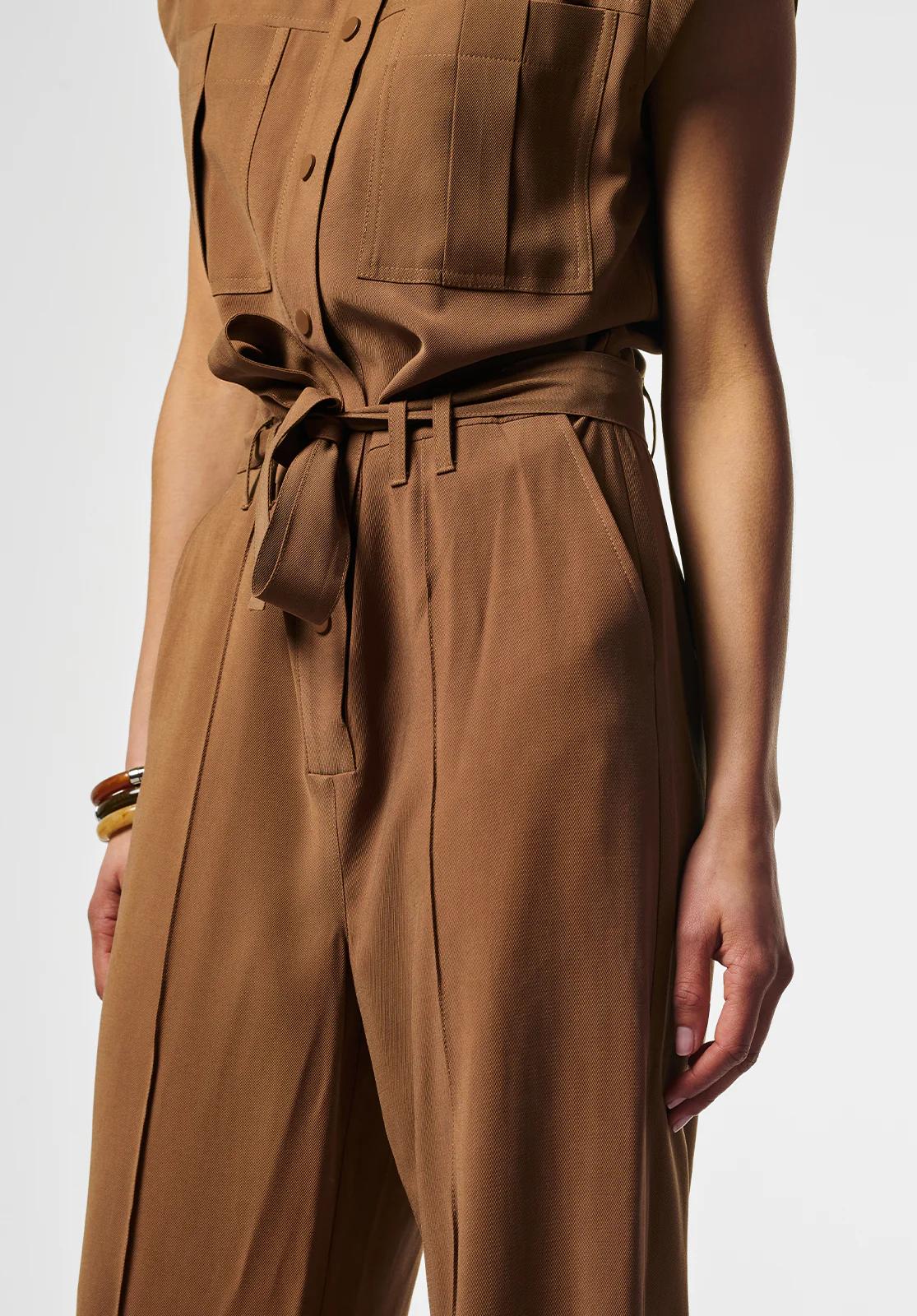 Maak kennis met de Aaiko Lisana Tencel jumpsuit in een prachtige hazelnootbruine tint. Deze stijlvolle jumpsuit is perfect voor de Nederlandse zomerdagen en biedt een combinatie van comfort en elegantie.