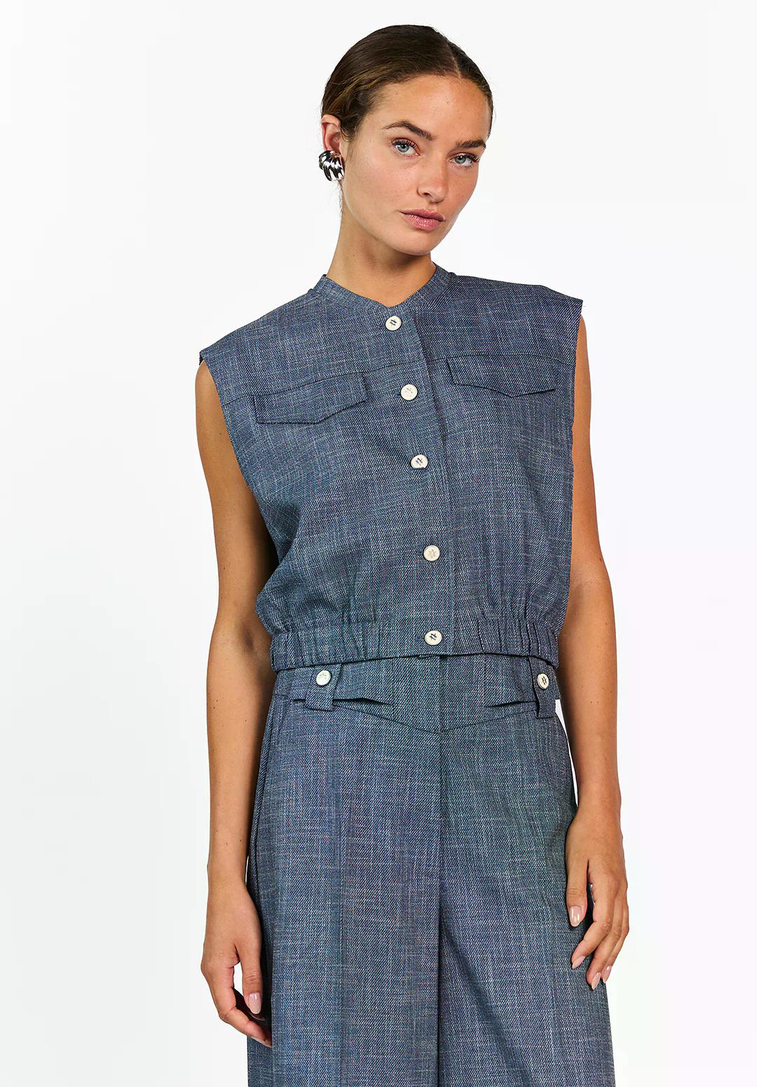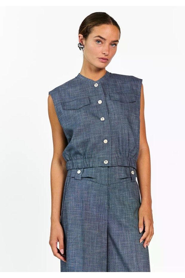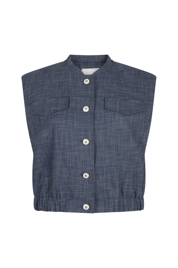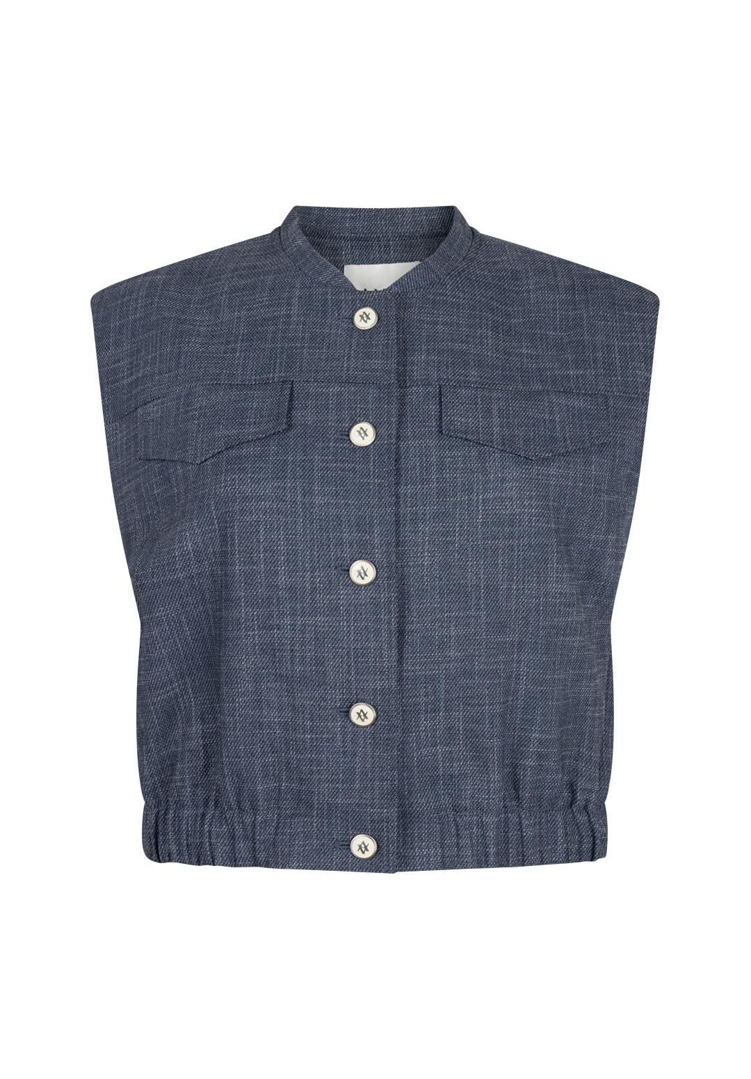 Maak kennis met de Olivia Denim Gilet van Aaiko in een stijlvolle donkerblauwe tint. Perfect voor de Nederlandse zomerdagen, dit gilet voegt een vleugje elegantie toe aan elke outfit.