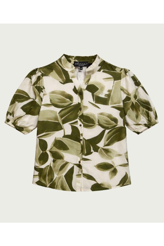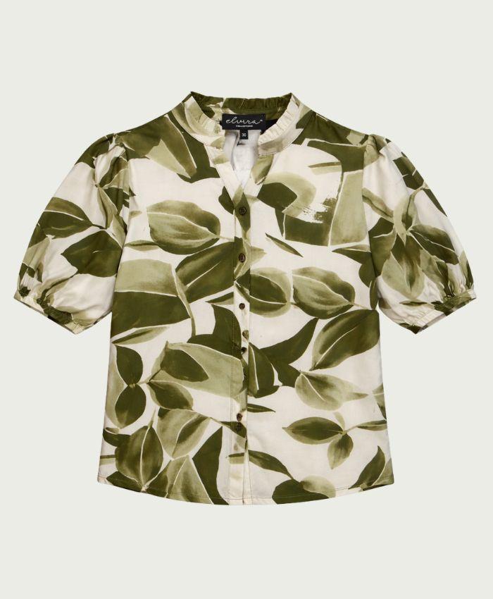 Maak kennis met de Blouse Mira van ELVIRA CASUALS, een stijlvolle toevoeging aan je zomergarderobe. Deze groene blouse met de unieke 'Green Desert Flower' print is perfect voor de modebewuste vrouw die houdt van een frisse en trendy look.