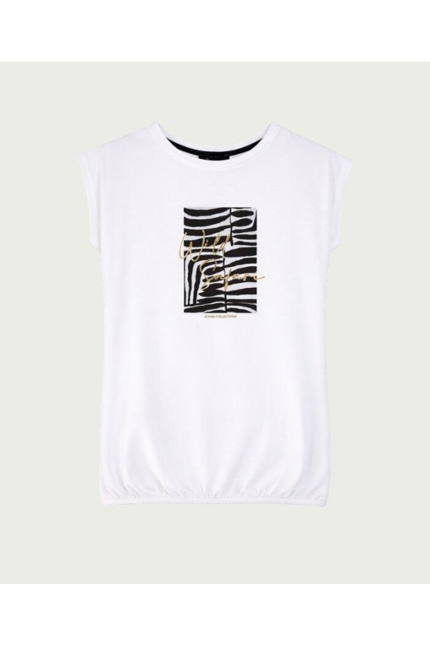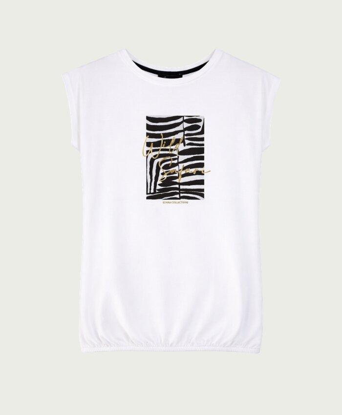 Maak kennis met het ELVIRA CASUALS T-shirt Safari in een stijlvolle off-white tint. Dit dames T-shirt met korte mouwen is perfect voor de Nederlandse zomerdagen en voegt een vleugje safari-chic toe aan je garderobe.