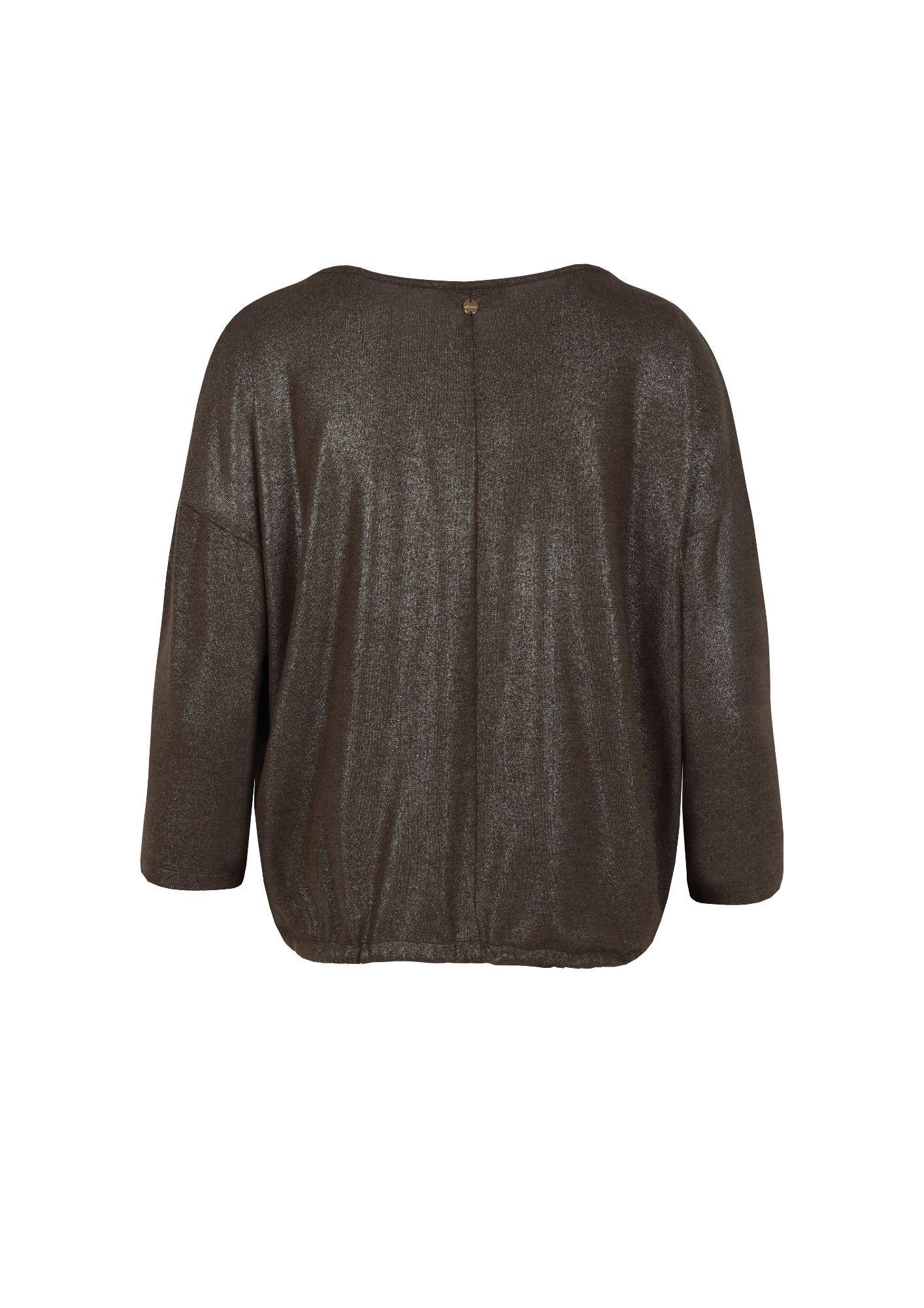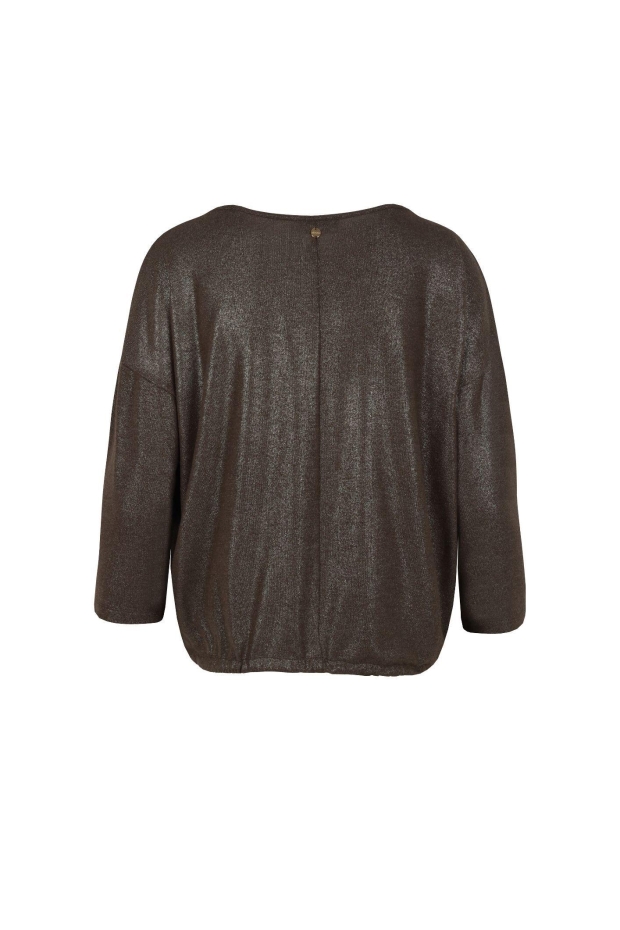 Maak kennis met de stijlvolle Top Britt van Elvira Casuals in bruin met gouden glitter. Deze casual top met korte mouwen is perfect voor dagelijks gebruik en voegt een vleugje glamour toe aan je wintergarderobe.