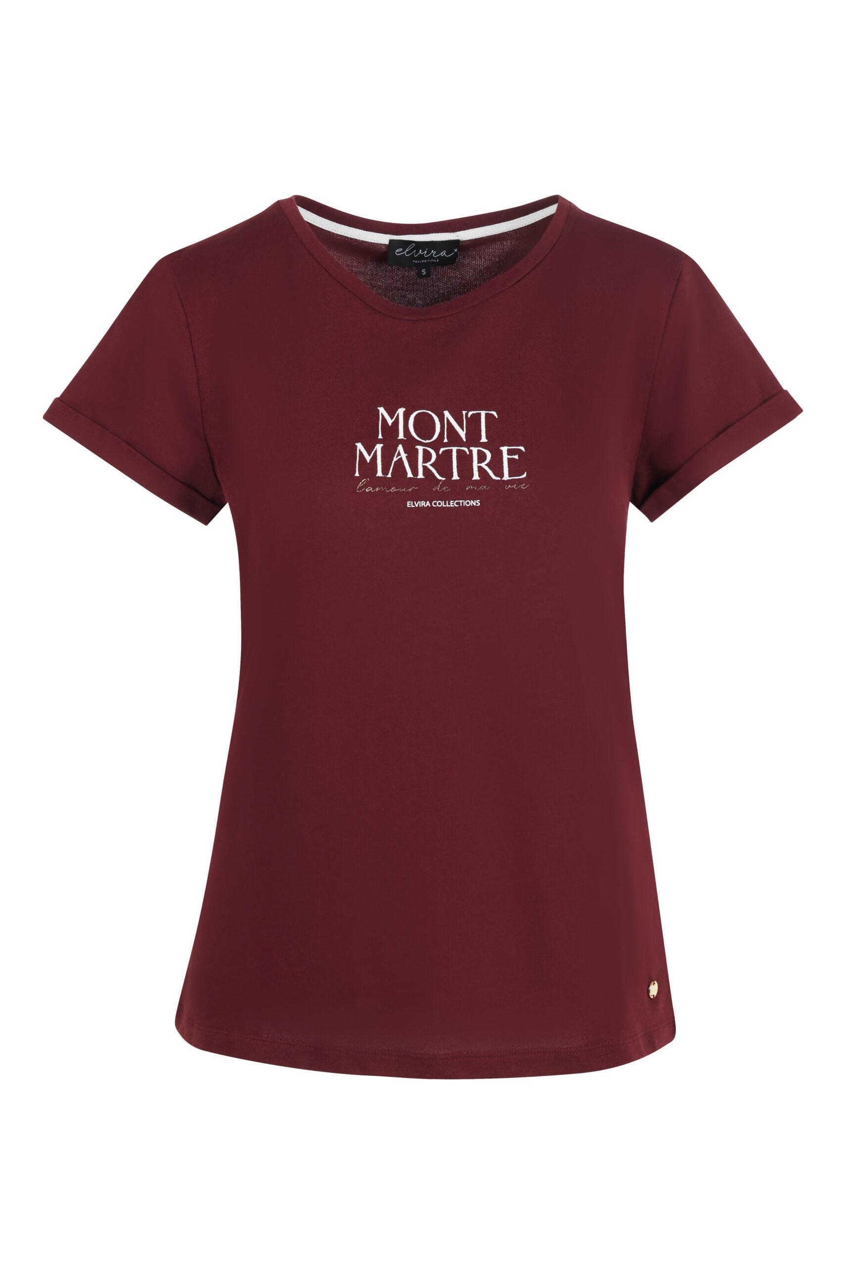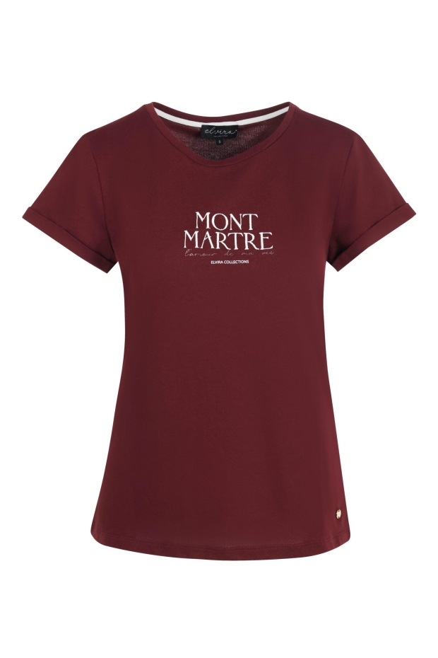 Maak kennis met het stijlvolle T-shirt Montmartre van Elvira Casuals in de prachtige kleur bordeaux. Dit T-shirt combineert comfort met een trendy uitstraling, perfect voor elke casual gelegenheid.