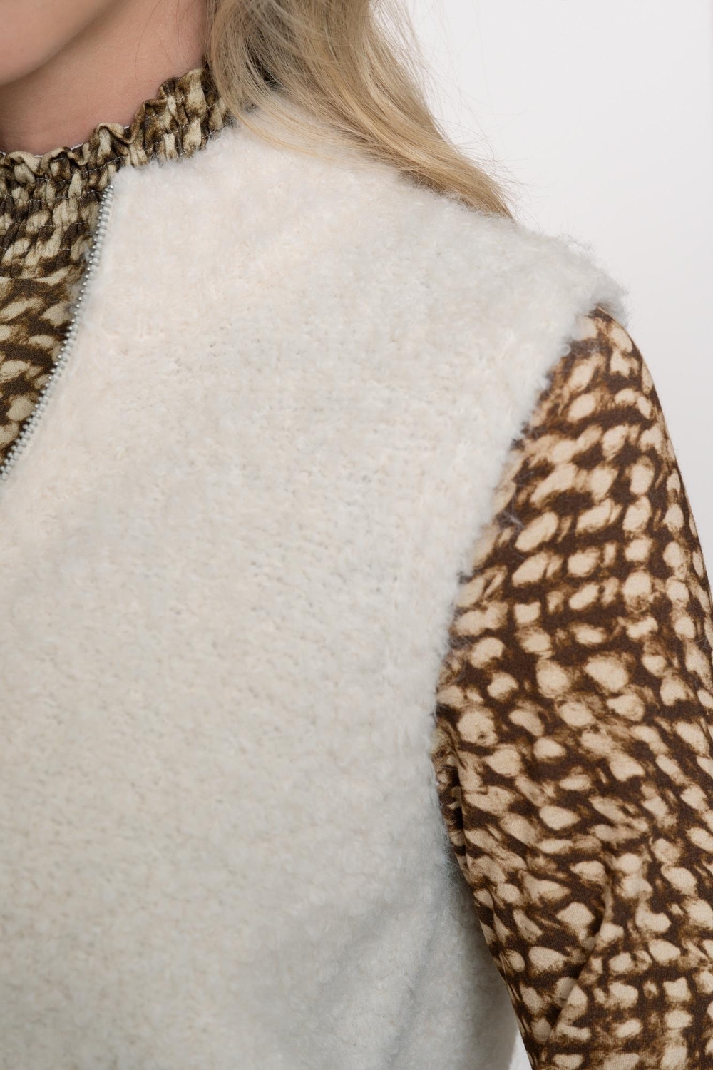 Maak kennis met de stijlvolle en veelzijdige mouwloze pullover van Geisha in een elegante off-white tint. Perfect voor de modebewuste vrouw die op zoek is naar een uniek en comfortabel kledingstuk voor de winter. Deze trui is ideaal voor een frisse ochtendwandeling langs de grachten of een gezellige avond met vrienden.