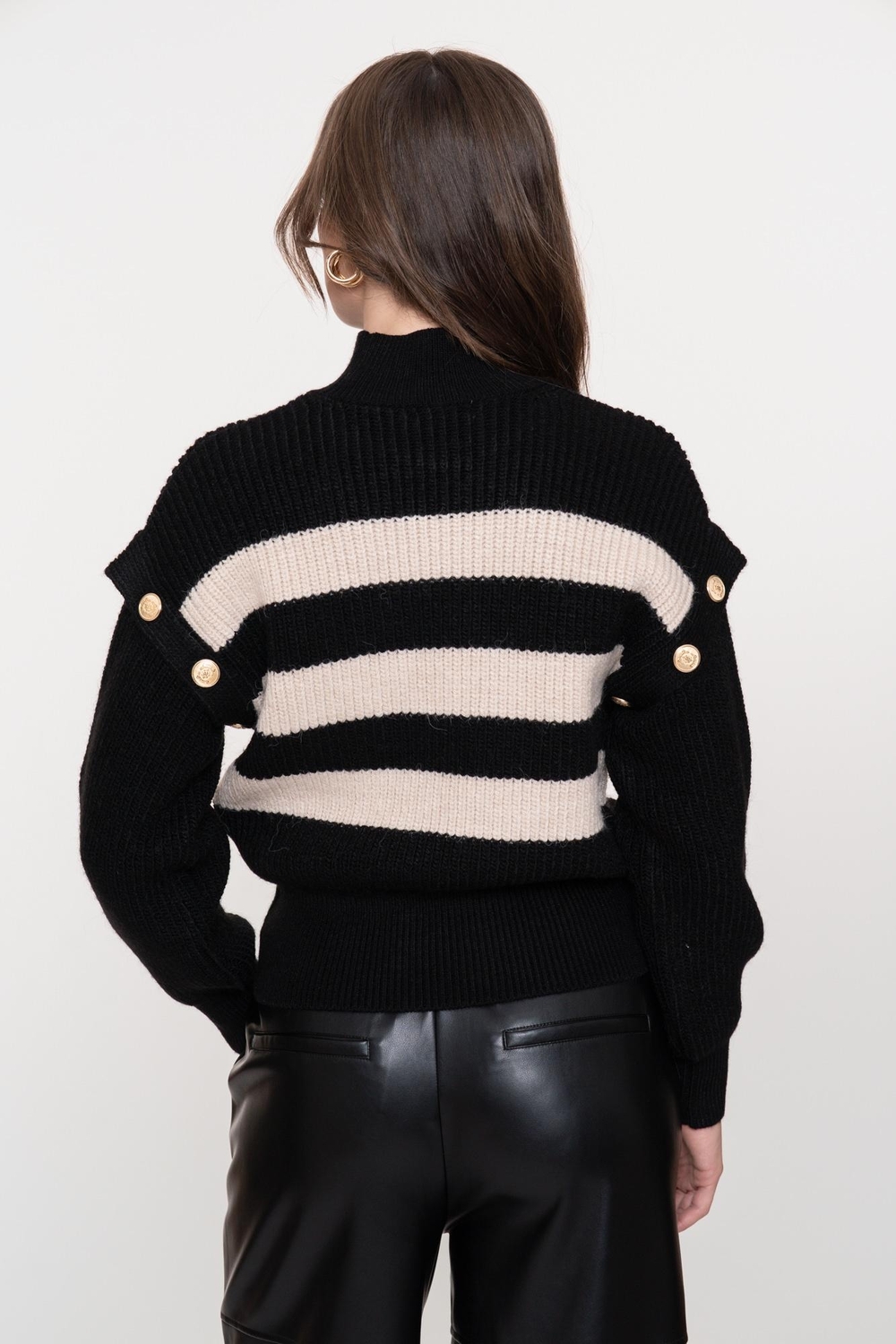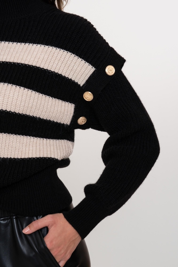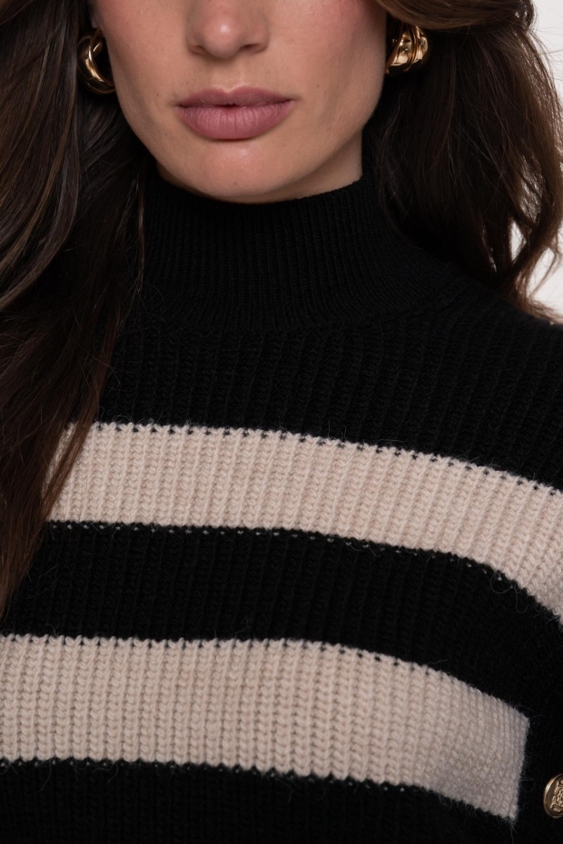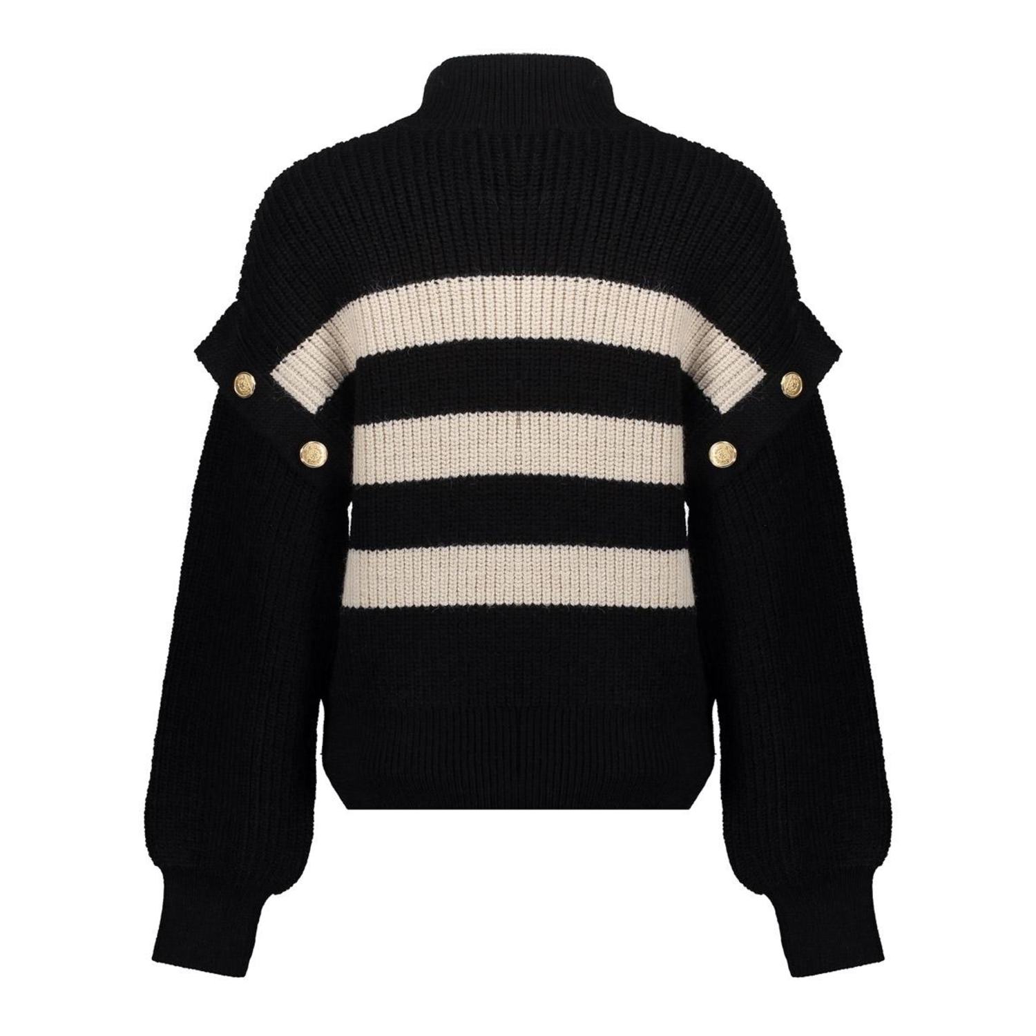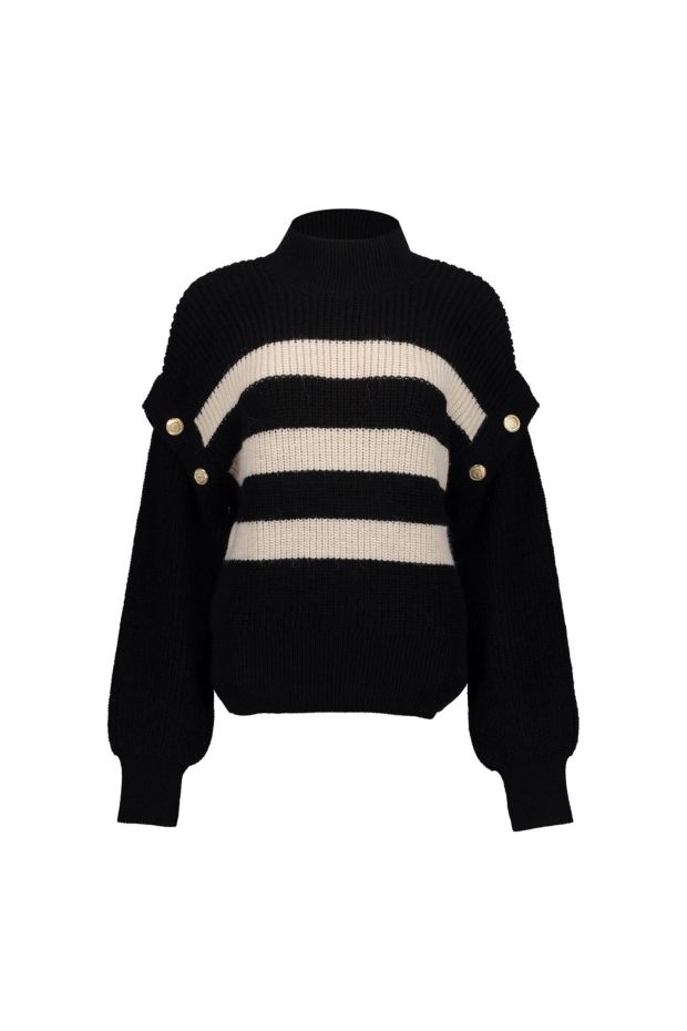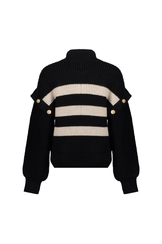 Ontdek de stijlvolle Geisha pullover met strepen en knoopdetails, perfect voor de modebewuste vrouw. Deze zwarte trui met off-white accenten is een must-have voor de wintermaanden. Ideaal voor een frisse ochtendwandeling langs de grachten of een gezellige avond bij de open haard.