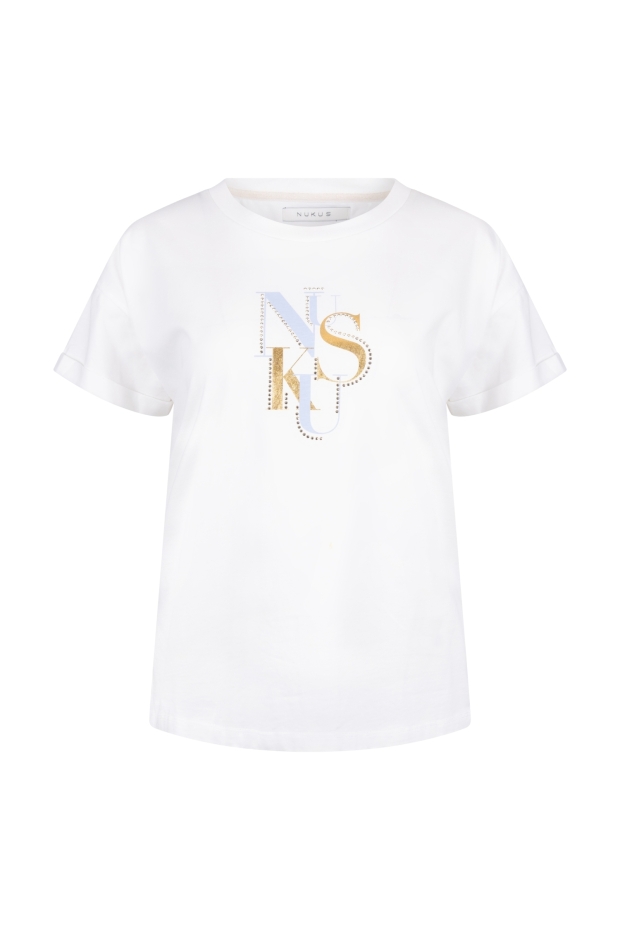 Maak kennis met de Rowena Shirt van NUKUS, een stijlvolle toevoeging aan jouw zomergarderobe. Dit off-white T-shirt met korte mouwen is perfect voor de zonnige dagen in Nederland.