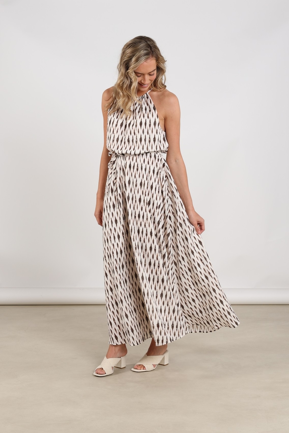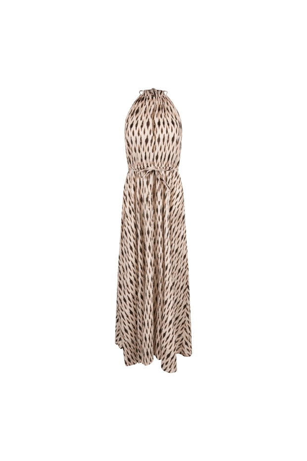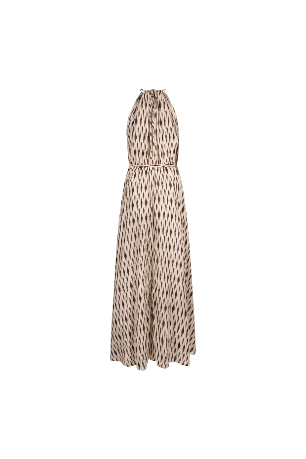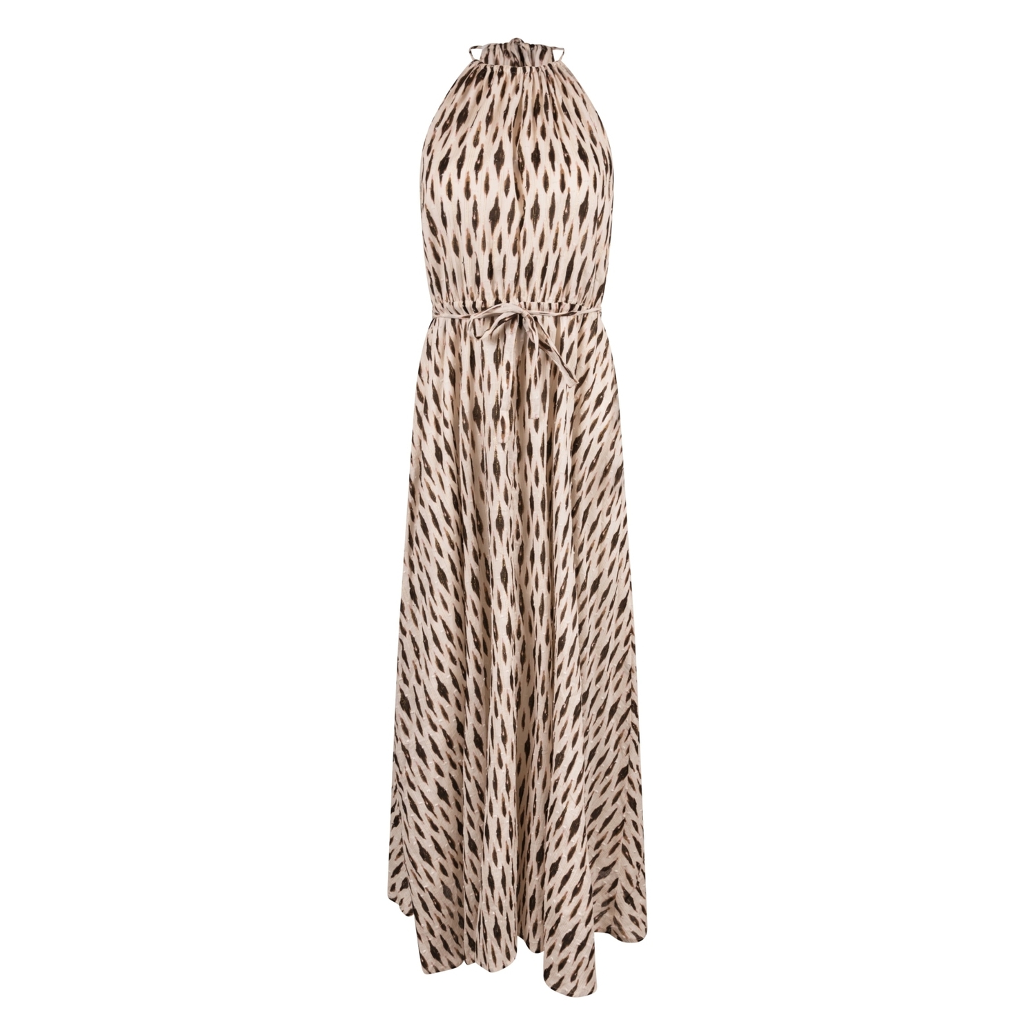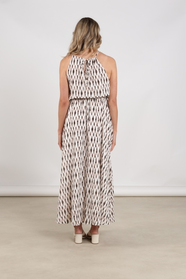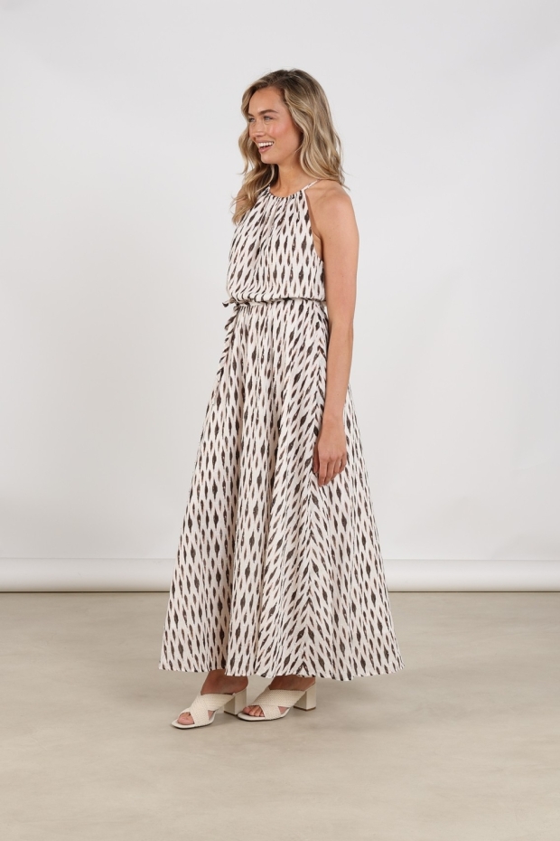 Maak kennis met de Monique Dress Print van NUKUS, een elegante lange jurk in een verfijnde off-white tint. Perfect voor zomerse dagen in Nederland, deze jurk straalt stijl en comfort uit.