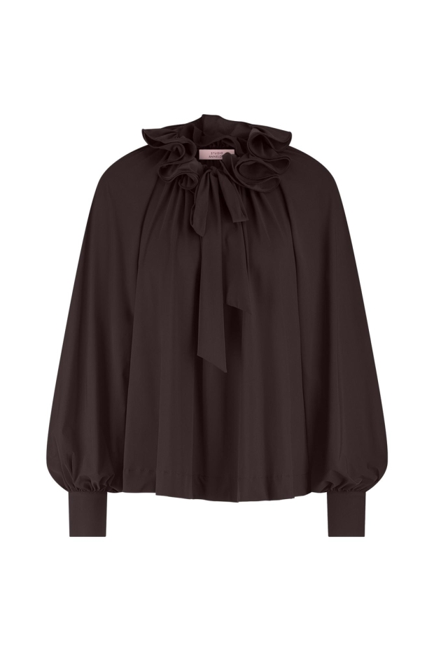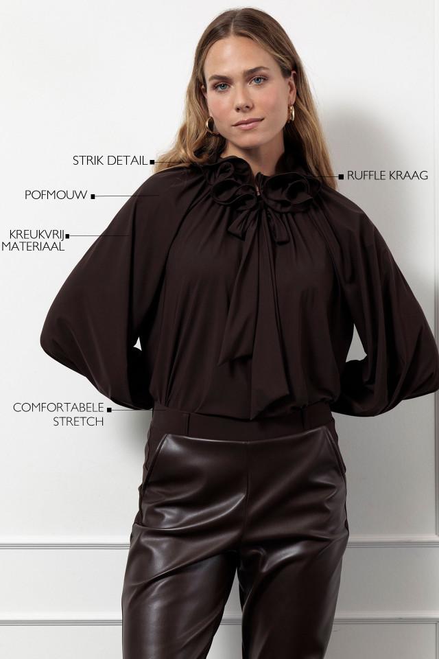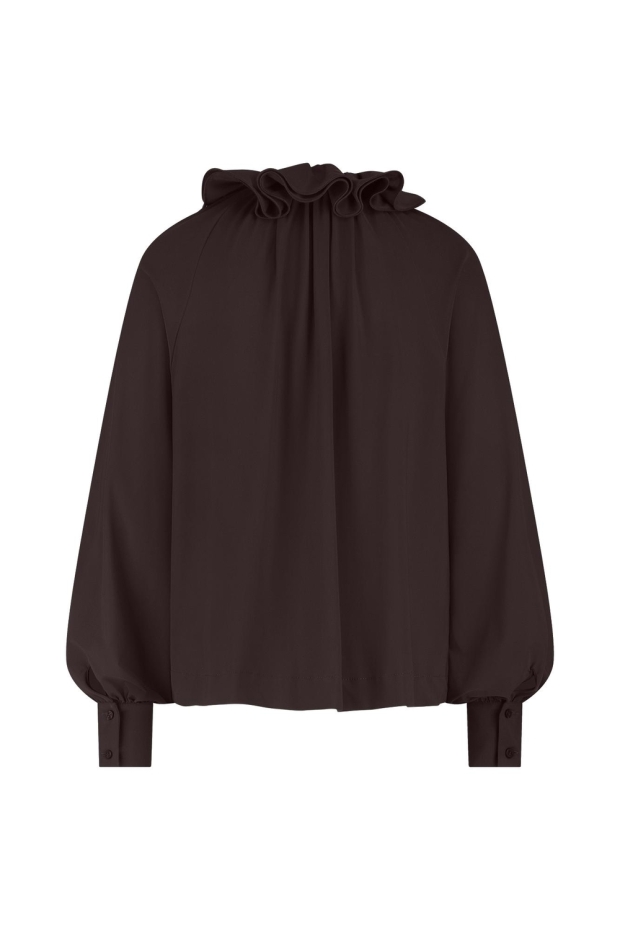 Maak kennis met de Palmer ruffle blouse van Studio Anneloes, een stijlvolle toevoeging aan je wintergarderobe. Deze donkerbruine blouse, ook wel 'espresso' genoemd, is perfect voor de modebewuste vrouw die houdt van een elegante en toch comfortabele look. Ideaal voor een dag op kantoor of een avondje uit in de stad.