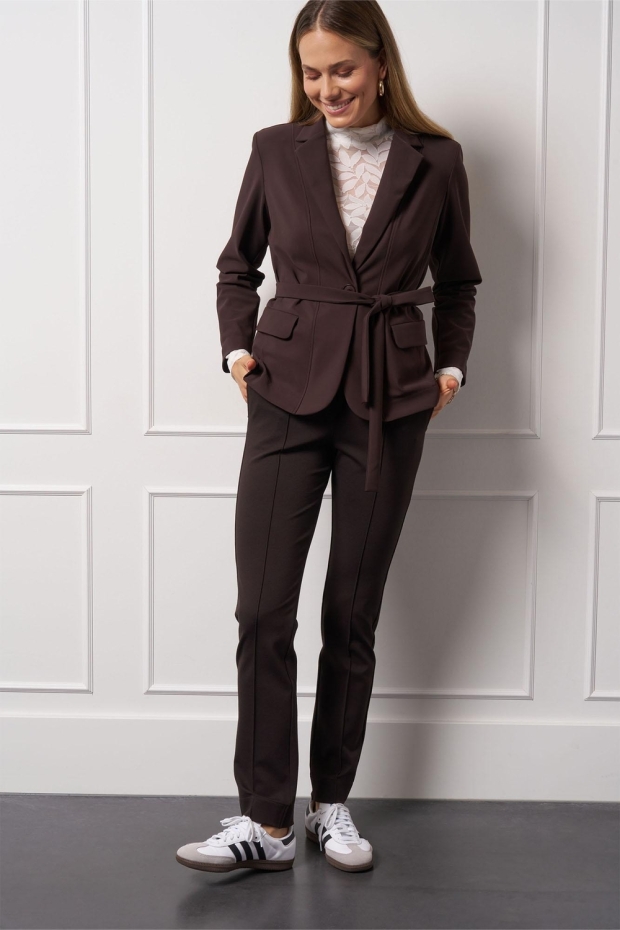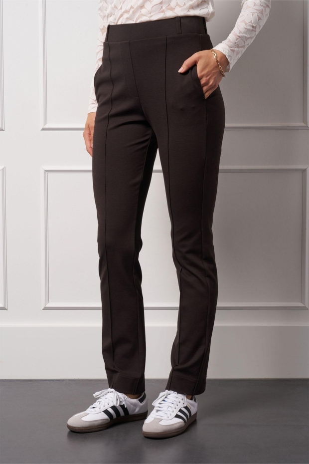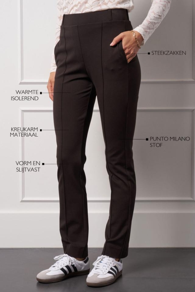 Maak kennis met de Marion punto trousers van studio anneloes, een stijlvolle en comfortabele keuze voor de modebewuste vrouw. Deze donkerbruine broek is perfect voor de Nederlandse winter en biedt een elegante uitstraling voor elke gelegenheid.