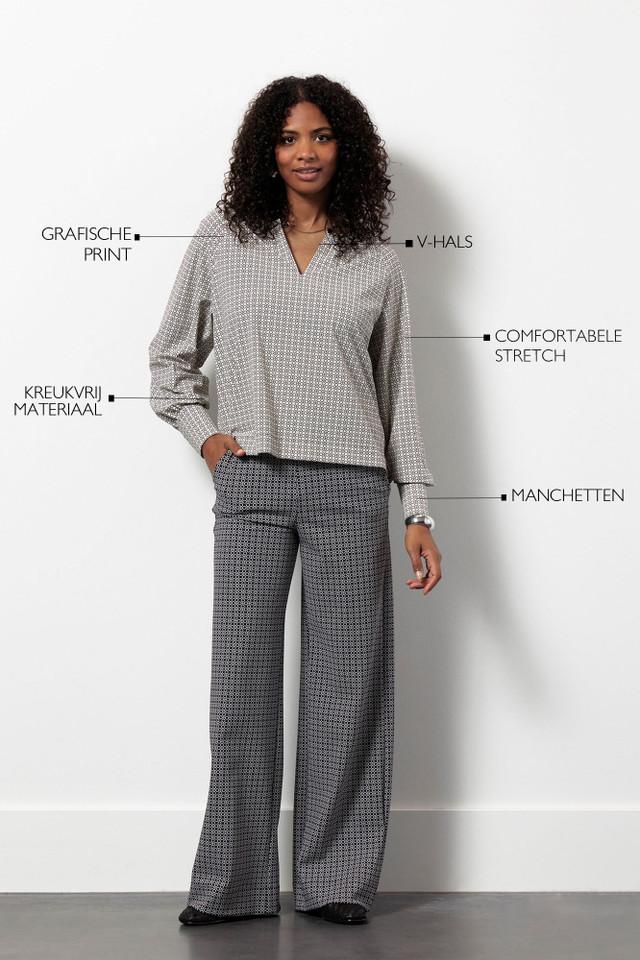 Verken de Charleze circle blouse van STUDIO ANNELOES, een stijlvolle toevoeging aan je wintergarderobe. Deze damesblouse in de kleur kit met zwarte accenten is perfect voor een wandeling langs de grachten of een gezellige avond uit.