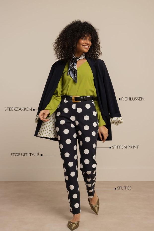 Maak kennis met de stijlvolle Anne polkadot trousers van STUDIO ANNELOES. Deze donkerblauwe damesbroek is perfect voor de zomer en biedt een speelse touch aan je garderobe.