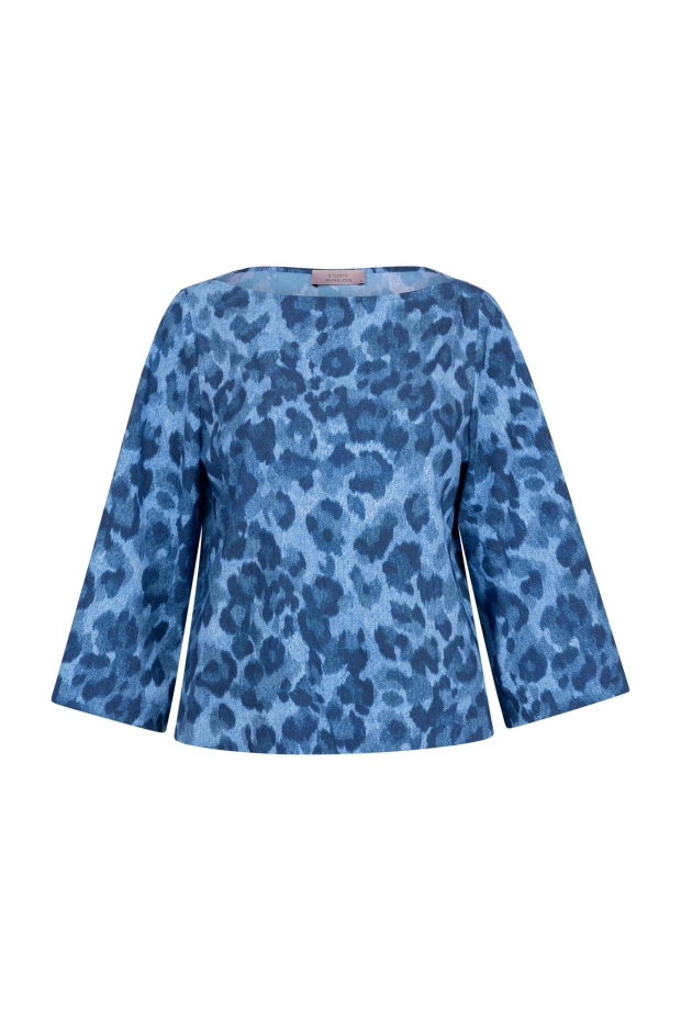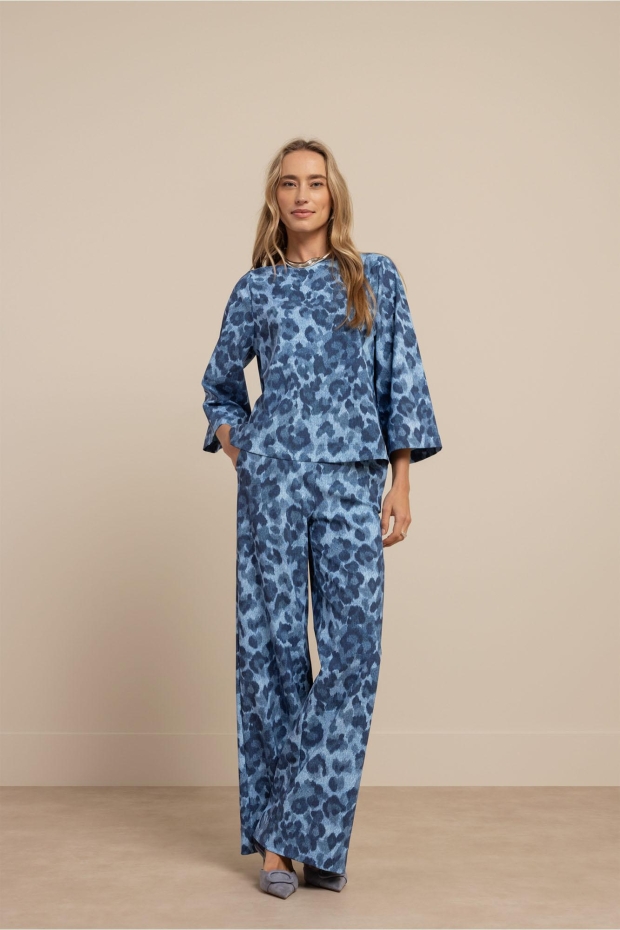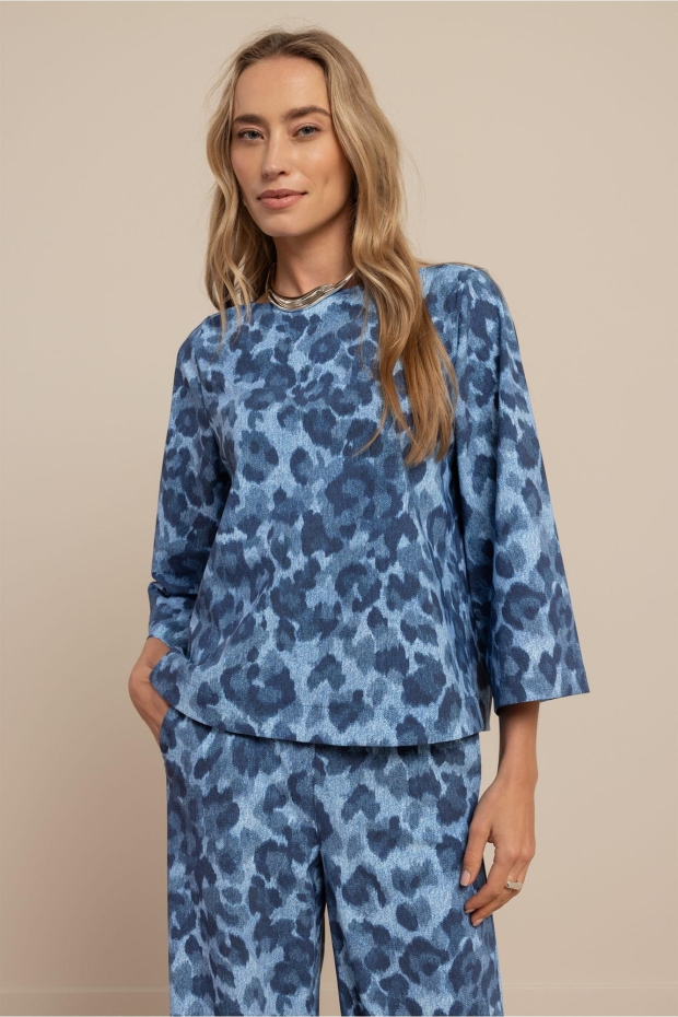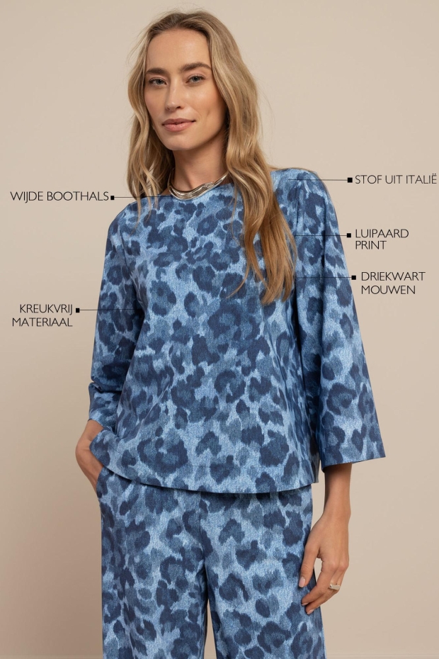 Maak kennis met de Ilja leopard top van STUDIO ANNELOES, een stijlvolle toevoeging aan je zomergarderobe. Deze blauwe top met korte mouwen is perfect voor een casual dagje uit in de stad of een zomerse avondwandeling langs de grachten.
