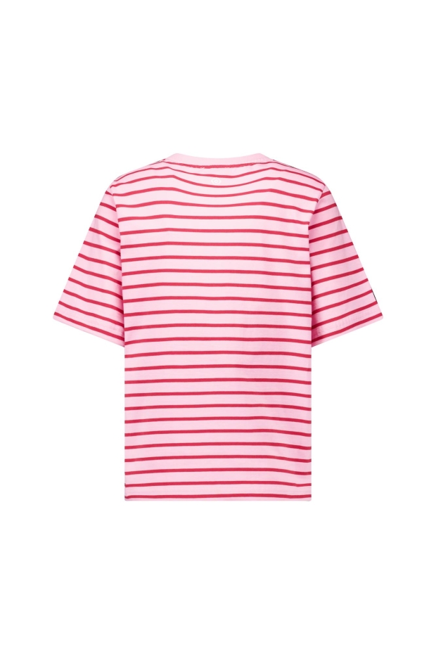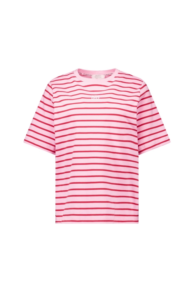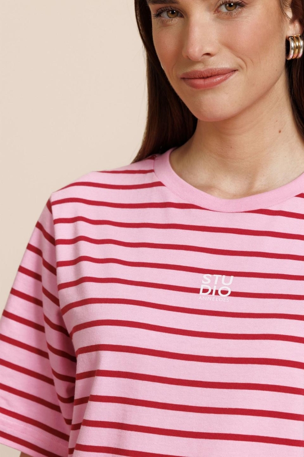 Maak kennis met het Stripe studio floor t-shirt van STUDIO ANNELOES, een perfecte aanvulling op je zomergarderobe. Dit dames T-shirt met korte mouwen in een opvallende rood en roze streep is ideaal voor een zonnige dag in het park of een casual dagje shoppen in de stad.
