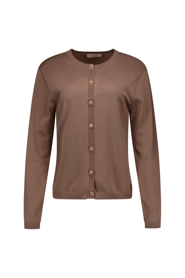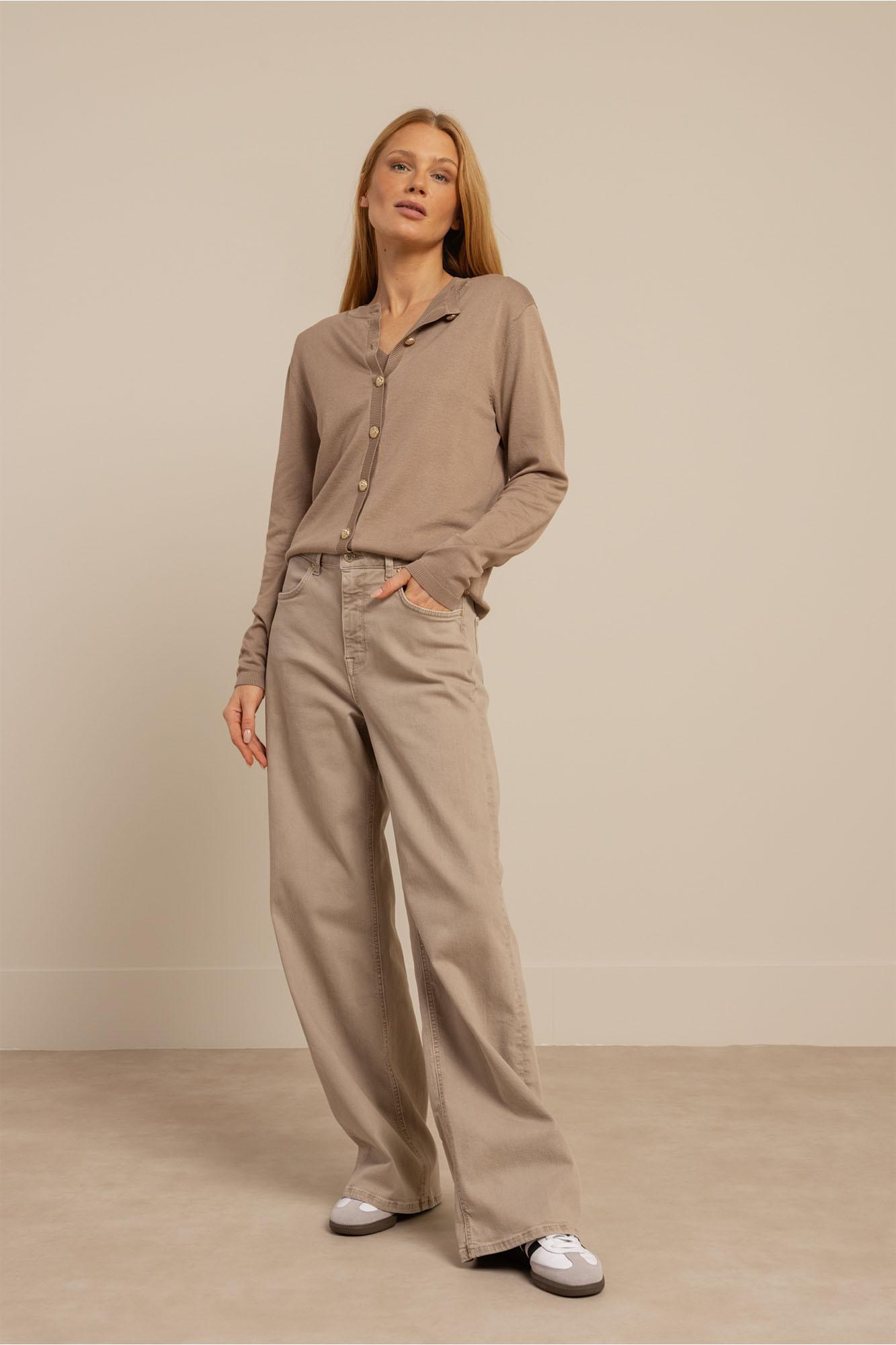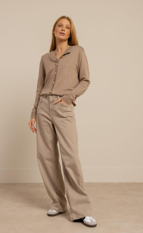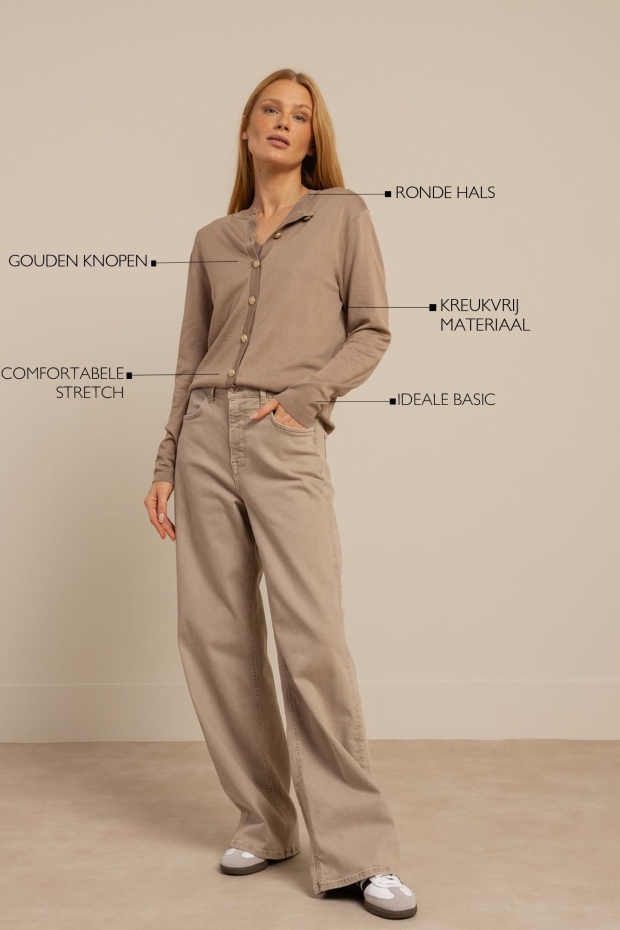 Maak kennis met de Jerry cardigan van STUDIO ANNELOES, een stijlvolle toevoeging aan je zomergarderobe. Deze zandkleurige cardigan, ook wel 'latte' genoemd, is perfect voor de Nederlandse zomers, wanneer de avonden wat koeler worden.