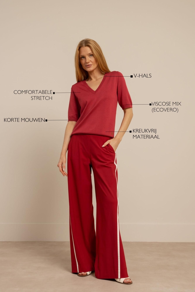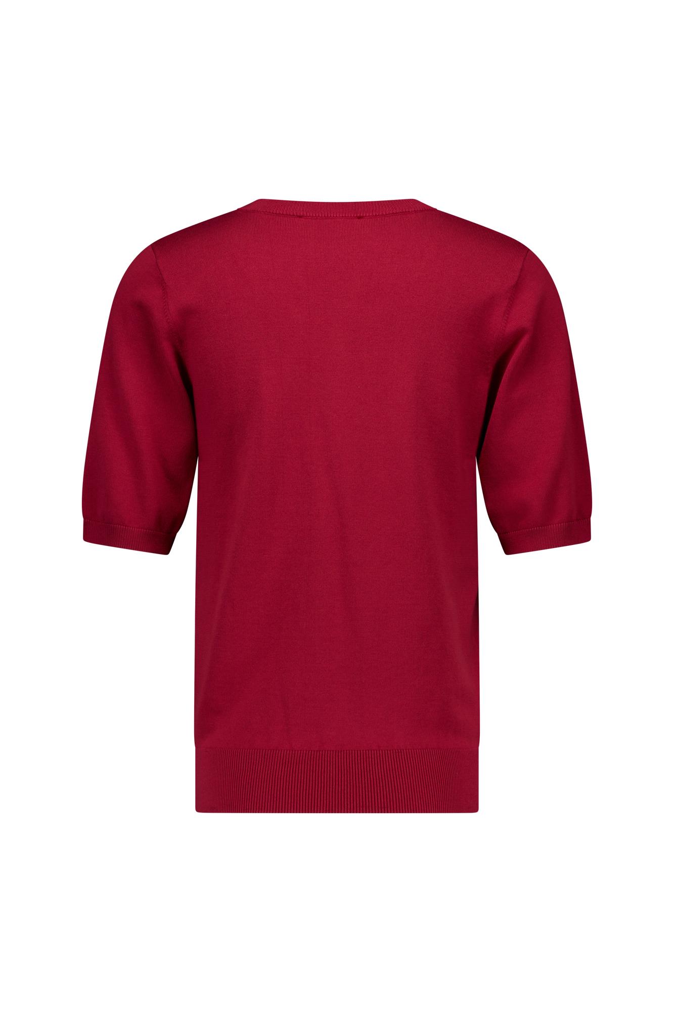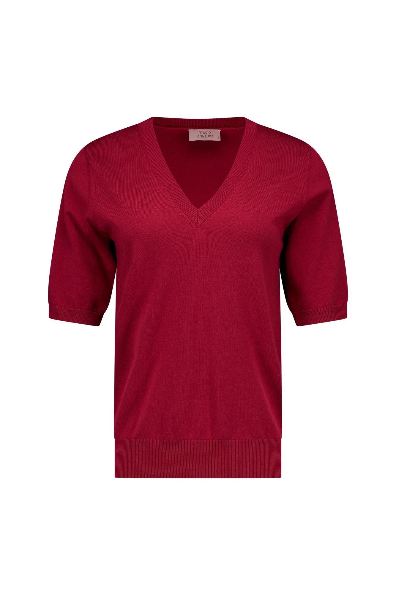 Maak kennis met de Truida pullover van STUDIO ANNELOES, een stijlvolle toevoeging aan je zomergarderobe. Deze korte mouw trui in een prachtige ruby red tint is perfect voor de Nederlandse zomerdagen.