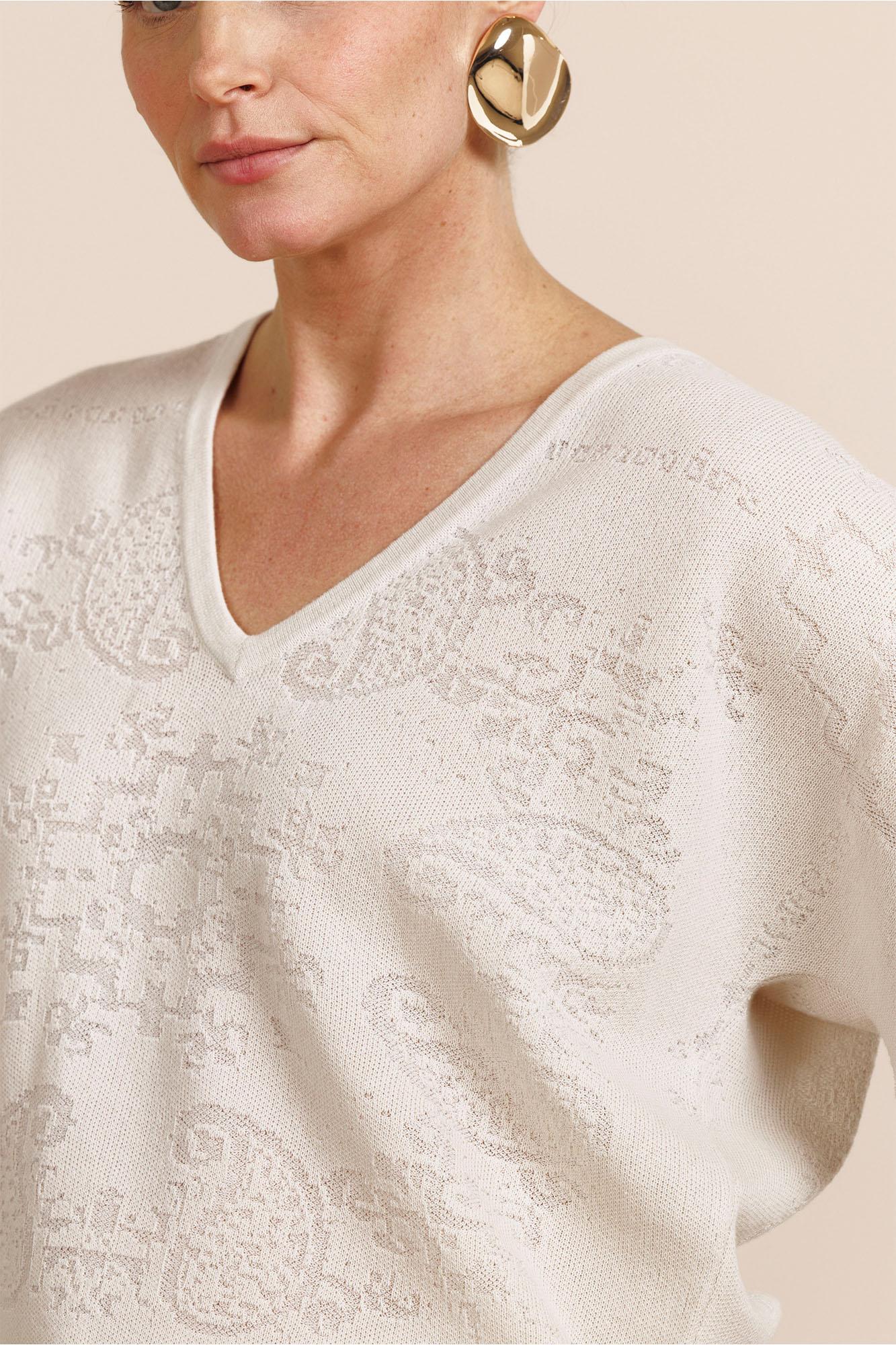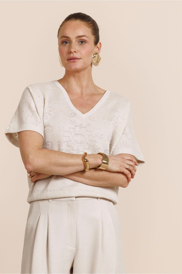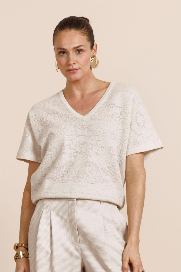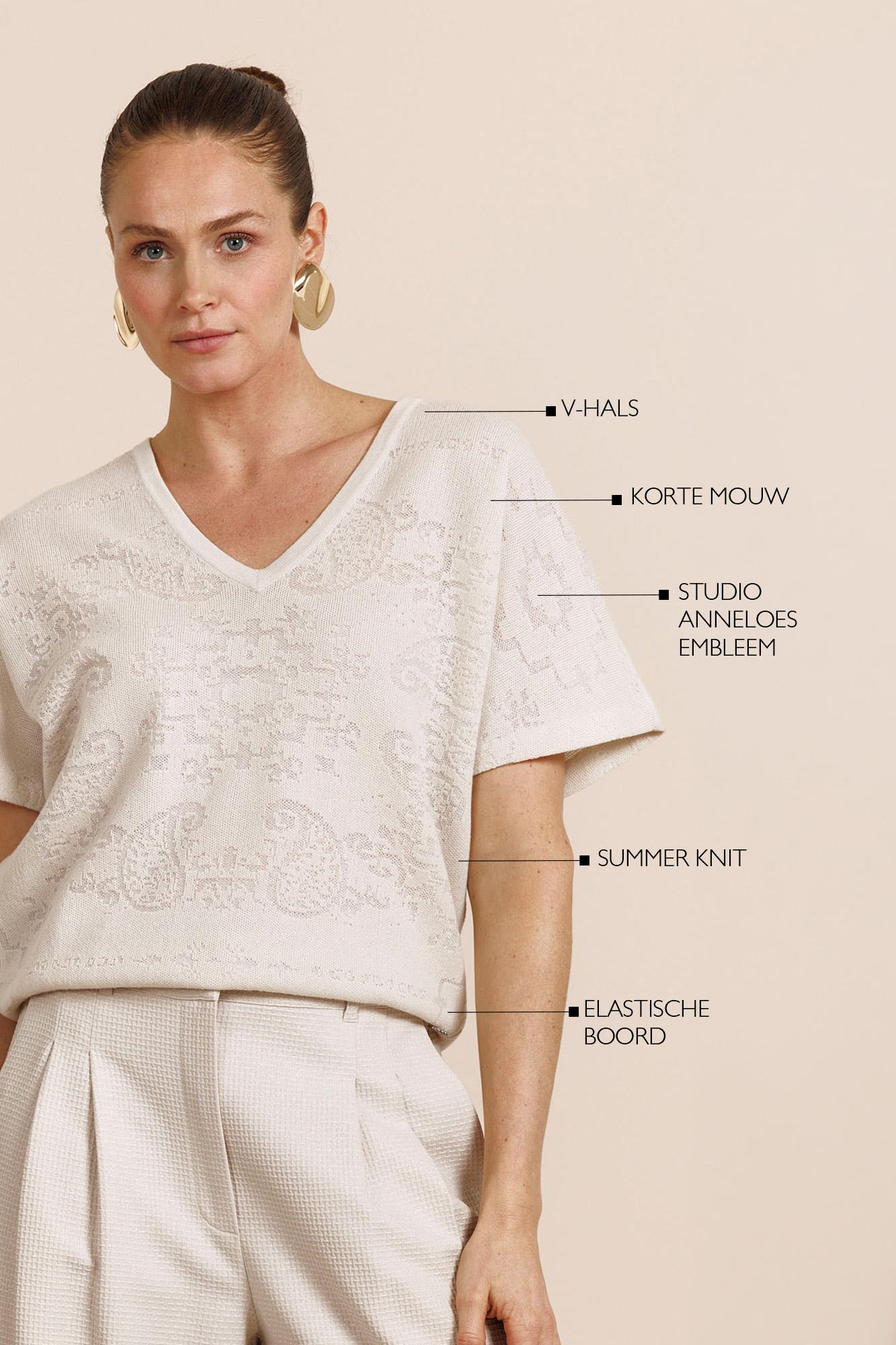 Verken de Robin paisley top van STUDIO ANNELOES, een stijlvolle toevoeging aan je zomergarderobe. Deze dames top met korte mouwen is uitgevoerd in een elegante kitkleur, perfect voor de Nederlandse zomerdagen.