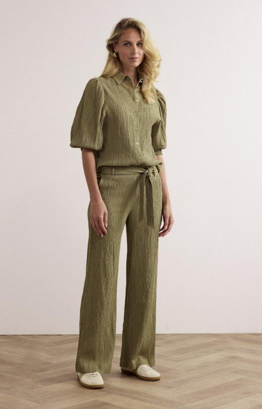 Maak kennis met de Creased Puff-Sleeve Blouse van TRAMONTANA, een stijlvolle toevoeging aan je zomergarderobe. Deze groene blouse met pofmouwen is perfect voor een zomerse dag in Nederland, of je nu door de straten van Amsterdam slentert of geniet van een terrasje in Utrecht.