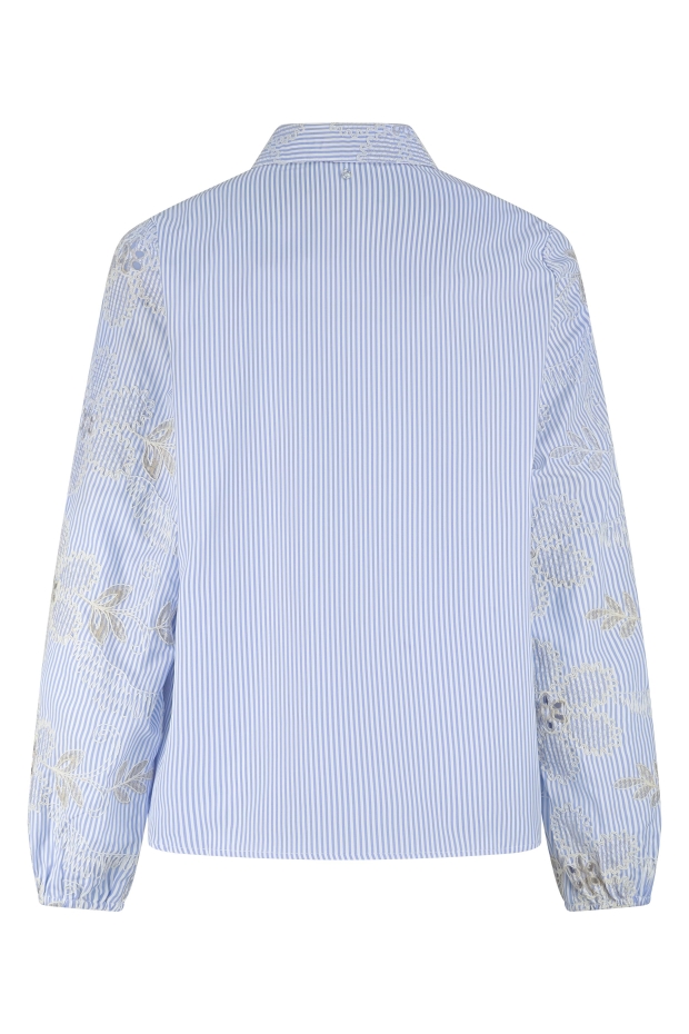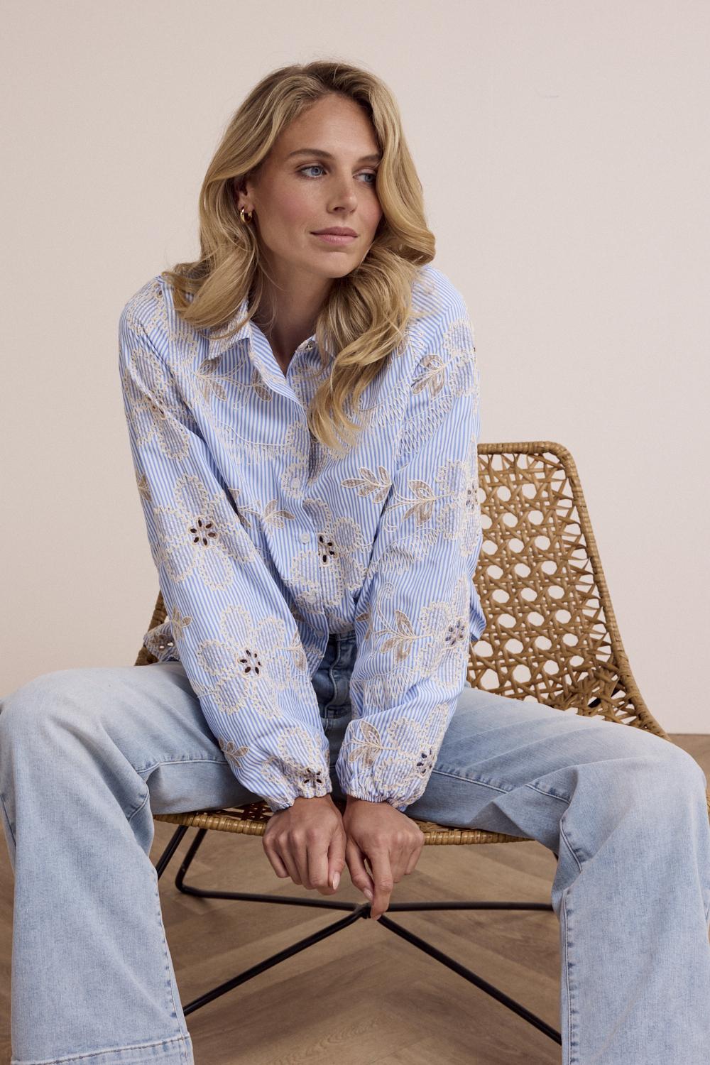 Ontdek de prachtige Flower Embroidery Blouse van TRAMONTANA in een frisse lichtblauwe tint, perfect voor de Nederlandse zomerdagen. Deze blouse straalt elegantie uit en is ideaal voor zowel casual als formele gelegenheden.
