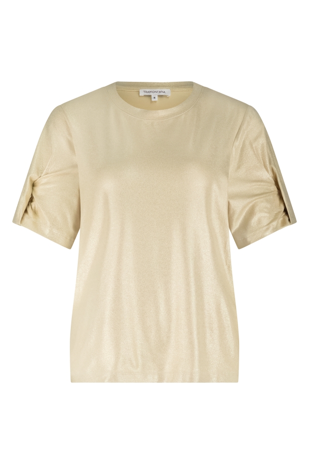 Ontdek de stijlvolle charme van het TRAMONTANA Coated T-Shirt in een prachtige beige tint. Dit dames T-shirt met korte mouwen is perfect voor de Nederlandse zomerdagen en voegt een vleugje elegantie toe aan je dagelijkse look.