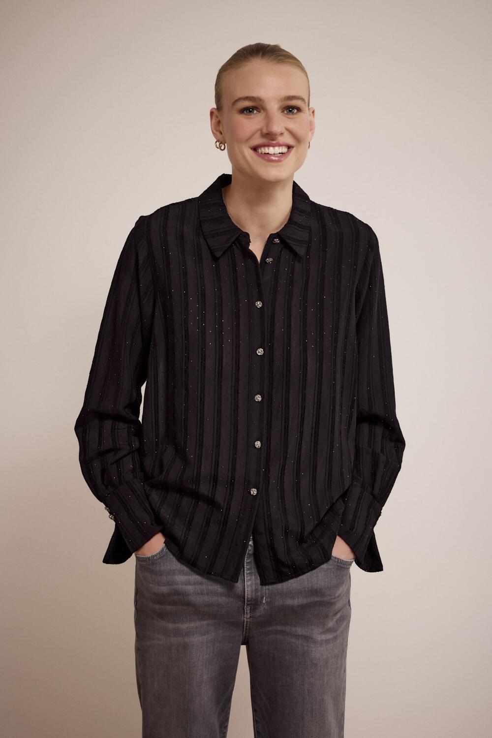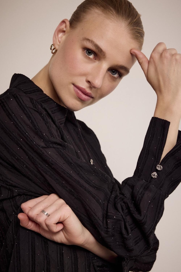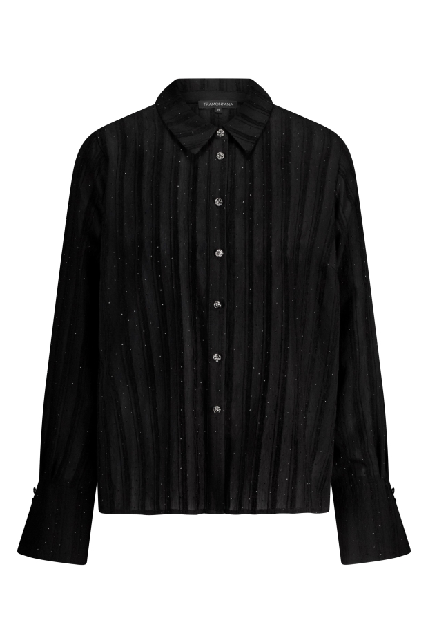 Maak kennis met de elegante Tramontana blouse met rhinestones, een must-have voor elke modebewuste vrouw. Deze zwarte blouse is perfect voor de wintermaanden en voegt een vleugje glamour toe aan je garderobe. Ideaal voor een avondje uit of een chique diner.