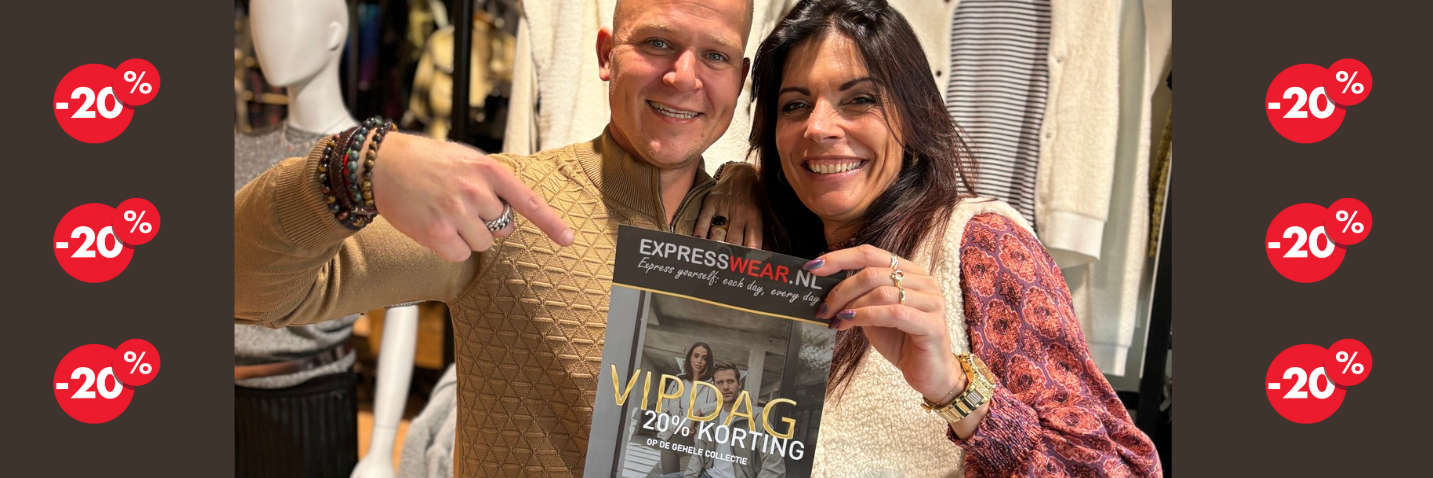 Op donderdag 2 april is het tijd voor hét mode-event van het seizoen: de Express Wear VIPdag! Als gewaardeerde klant zetten we jou in de schijnwerpers en profiteer je 24 uur lang van 20% korting op een enorme selectie van onze nieuwe collecties.
