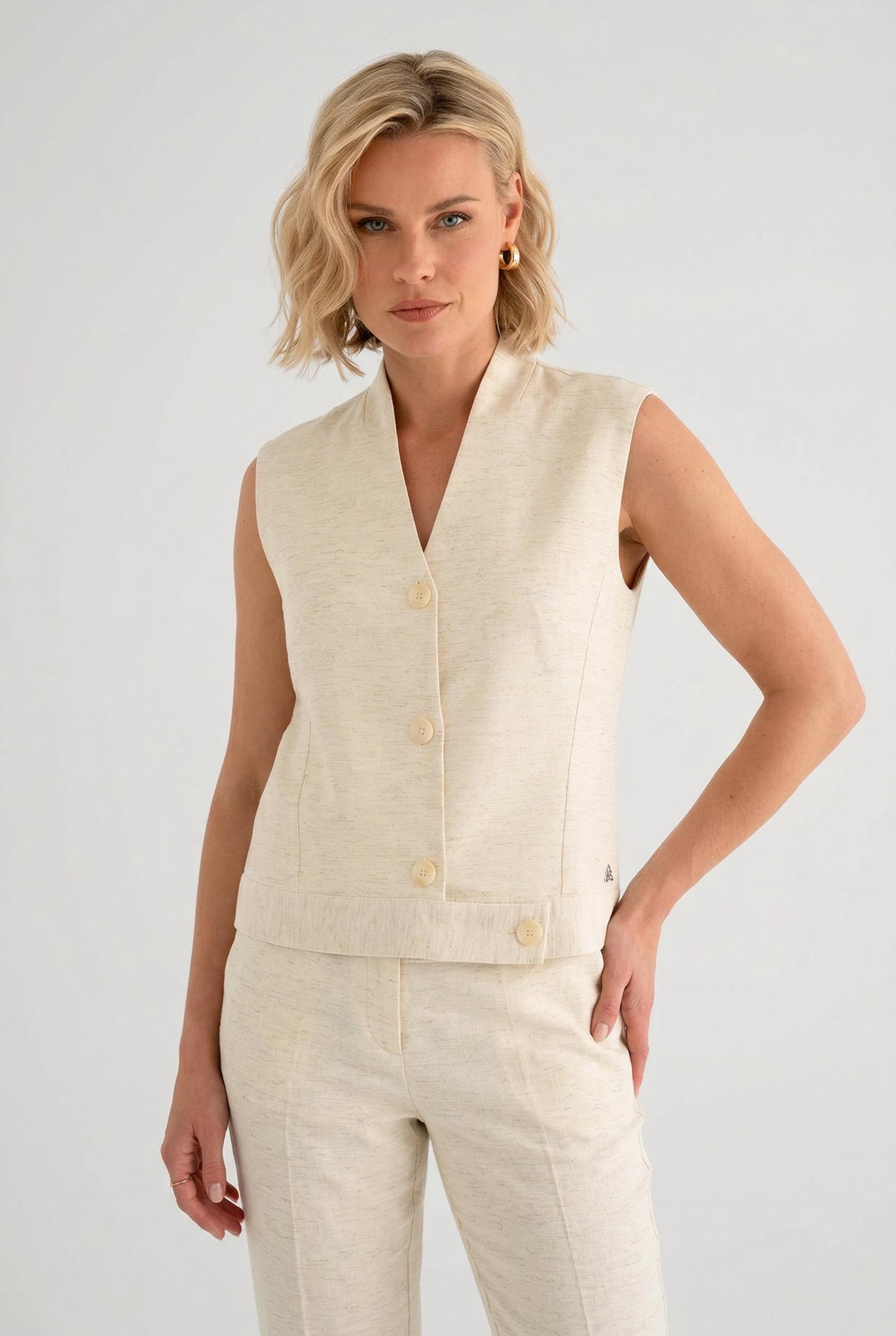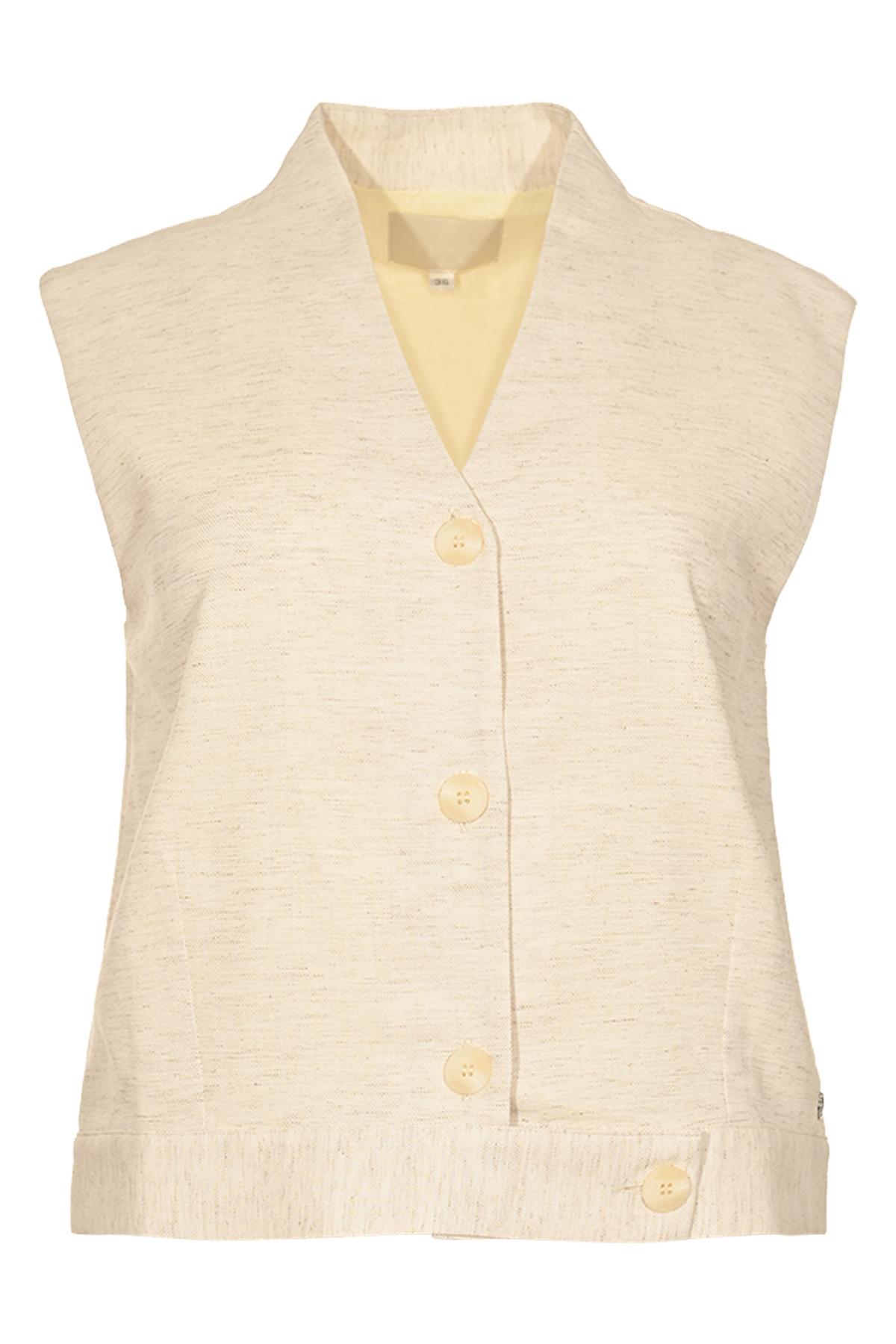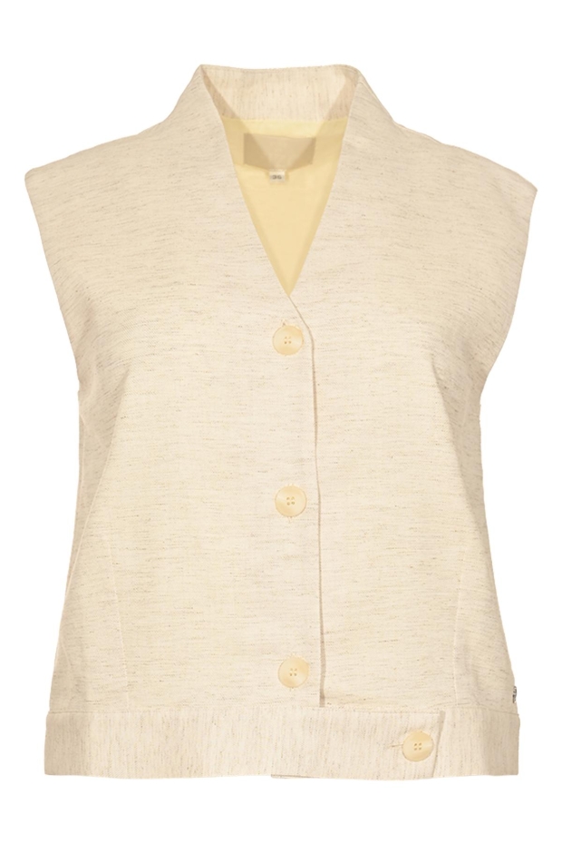 Maak kennis met de SHINA gilet van ZIZO in een elegante offwhite tint. Dit damesvest is een perfecte aanvulling op je zomergarderobe en straalt een tijdloze charme uit.